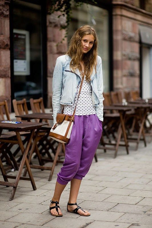 Youth option: cropped sharovary of rich purple hue, polka-dot shirt, denim jacket, laconic sandals and a small handbag over the shoulder.