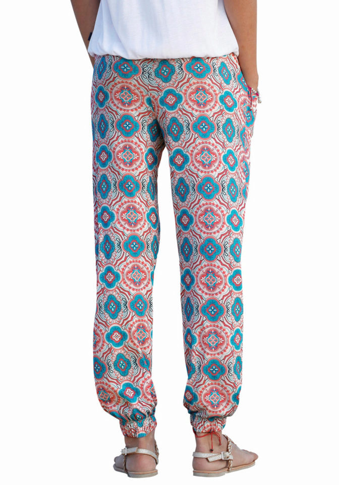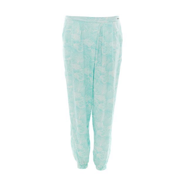 PARAMITA trousers: light, flowing fabric (100% viscose), thin white pattern on a light turquoise background, side pockets.