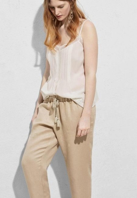 Pants from Violeta by Mango: 100% linen, natural colors, sleek design, interesting details: belt with tassels and cuffs on the trouser.