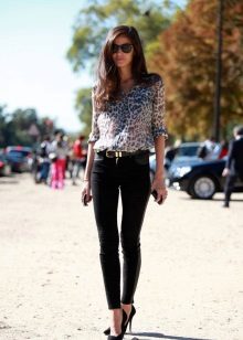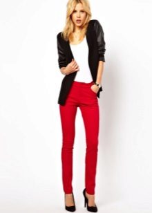 Skinny pants today are appropriate in any situation and situation. The main thing is a well-formed suit. In the office with such trousers should wear shirts or blouses, fitted or fitted silhouette. Above can be a vest, jacket, jacket or cardigan, but be sure to shorten it. Shoes in the office need to pick the most closed, even in the summer. Skinny looks equally advantageous with both high heels and shoes with flat shoes - loafers, ballet shoes, creepers, etc.