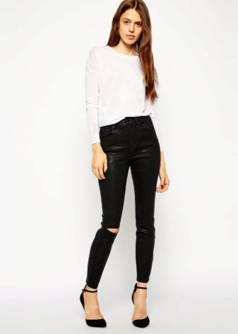 And another criterion - the length of the leg. In the classic skinny pant leg comes to the ankle. But in modern models it is also possible shortened leg - 7/8 or even 3/4, or, on the contrary, elongated, reaching to the heel. Heavily shortened models are visually robbed in height, so only tall girls are allowed to wear such skin.
