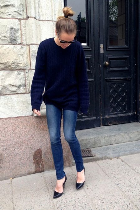Minimalistic images are no less spectacular. Pumps and a large knit sweater to match the shoes — you can go to work or to date.