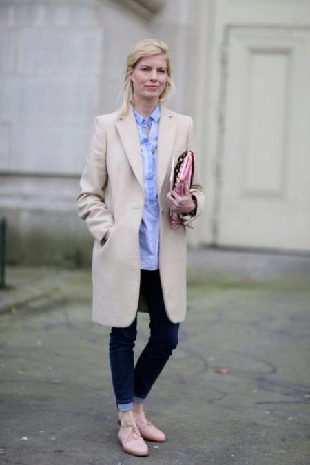 The dandy style in the female image has long become a classic. This option will be both strict and gentle at the same time. It is all due to the game of contrasts: dark blue jeans are opposed by a soft blue shirt and a soft cream-colored coat and oxfords, matched to the tone.