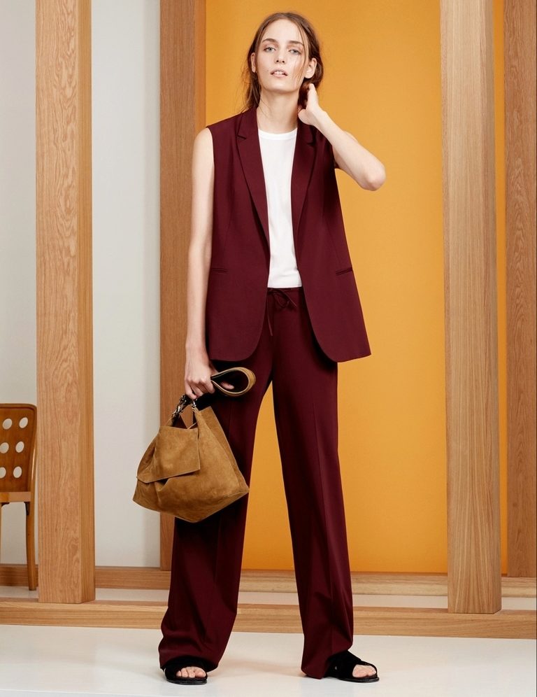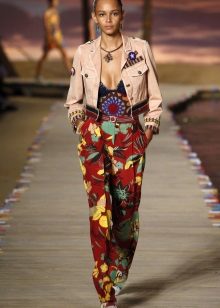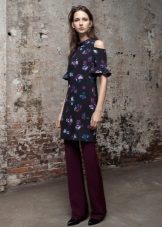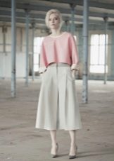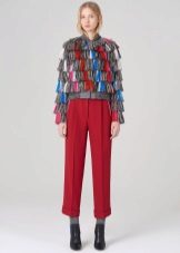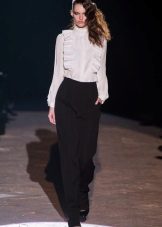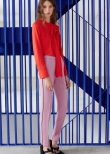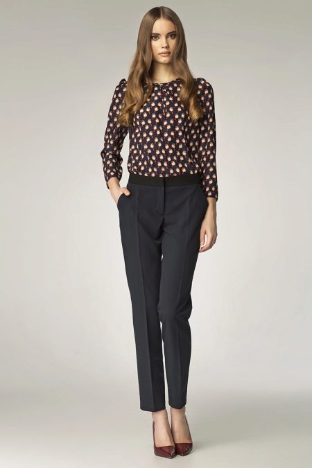 In combination with this model of trousers, a light black silk blouse with a simple print in the form of small birds is perfect. She has no fasteners and has a small bow in the neckline,. And the highlight of the image and a bright spot at the same time will be maroon low-heeled shoes.