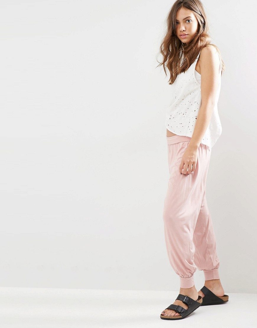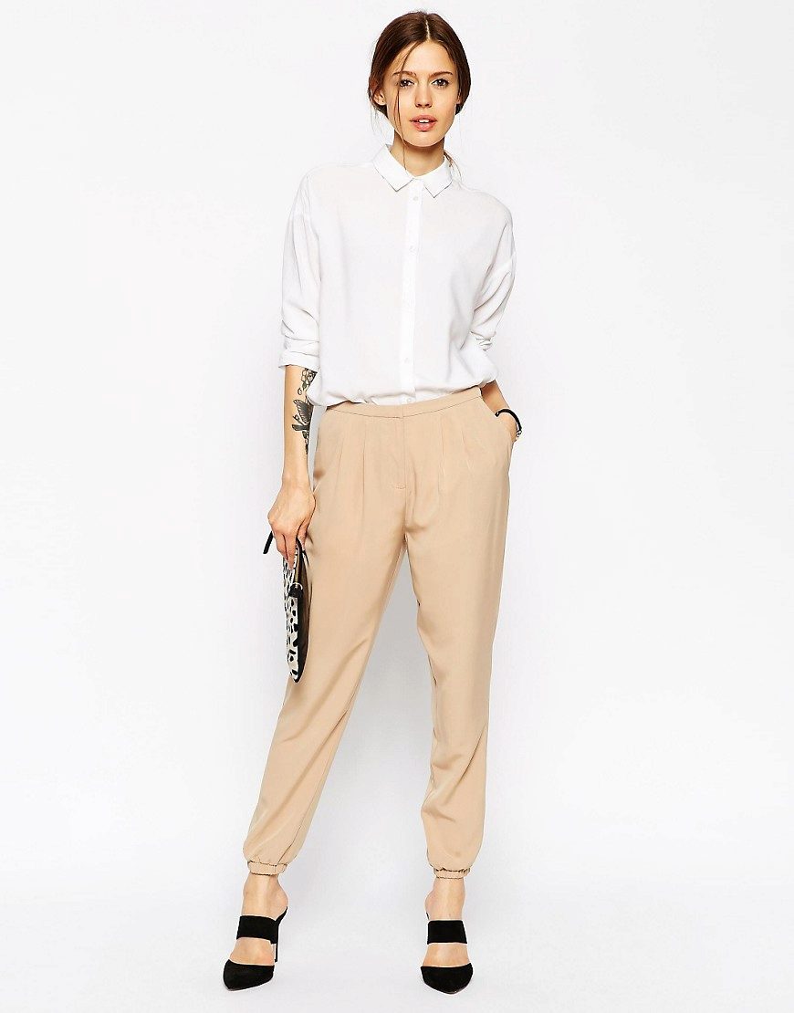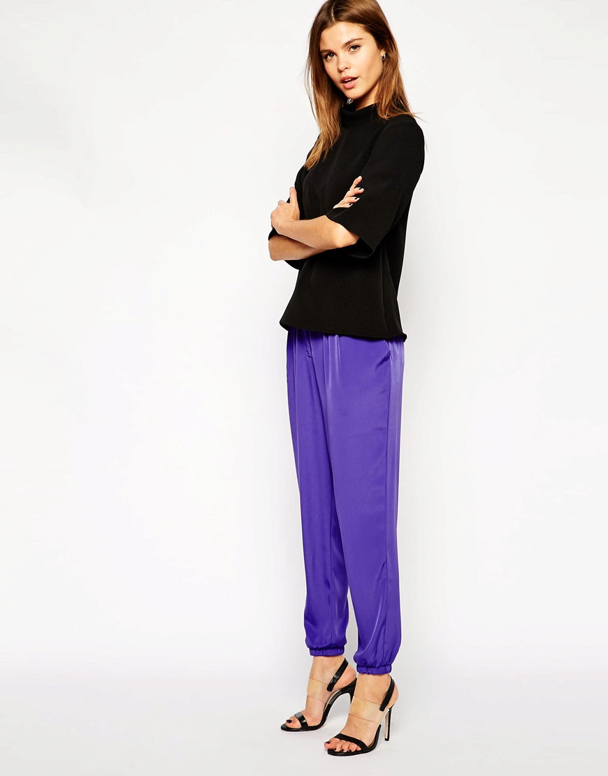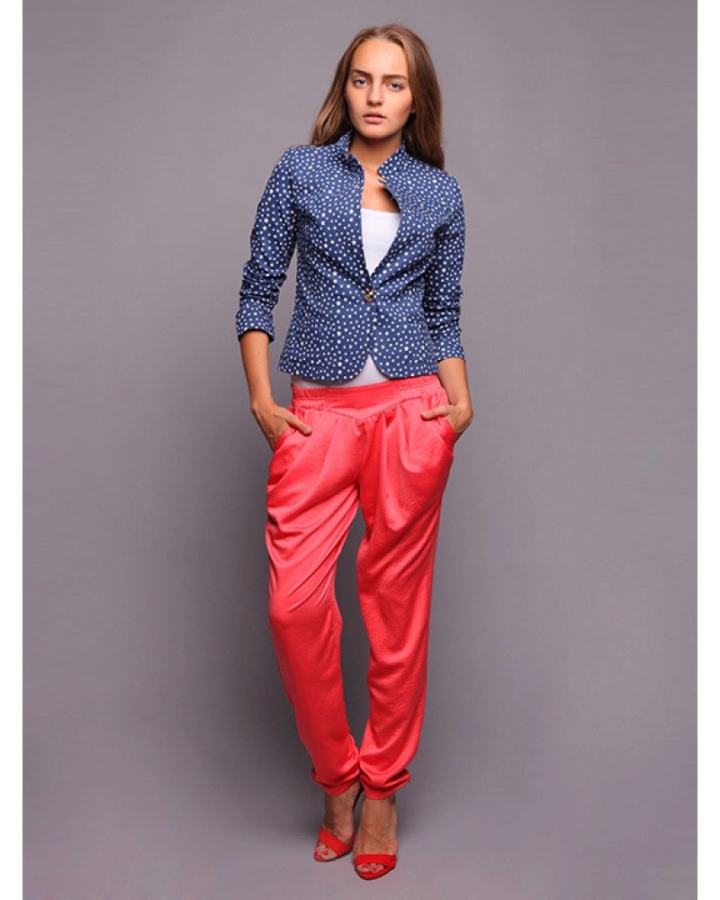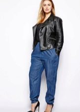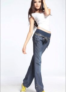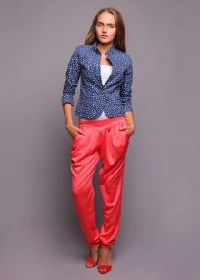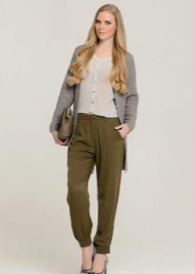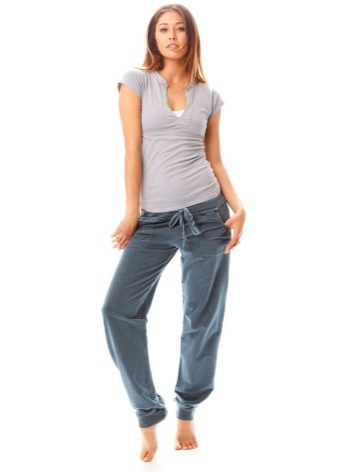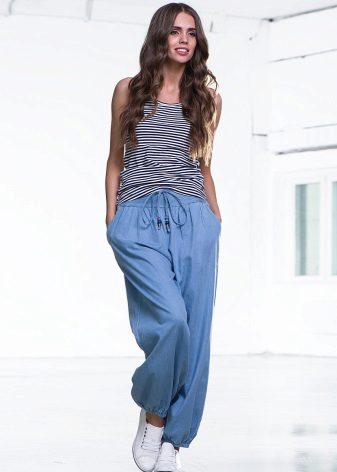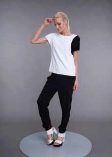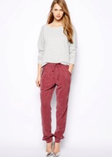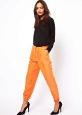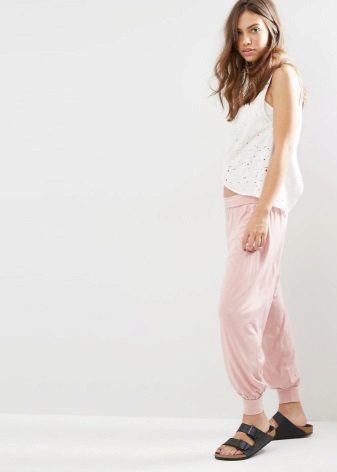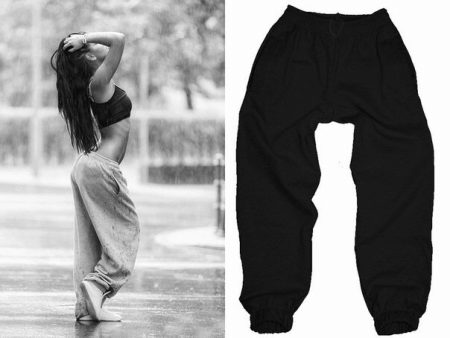 This style of pants is convenient not only for sports, but also for walks and daily activities, as they are free, but they do not interfere when walking or in transport, due to the gum. In addition, this feature of the cut allows the product to sit exactly on the figure. Ideally sitting thing favorably emphasizes the dignity of the figure. But with the help of wide pants you can hide the shortcomings of the legs.