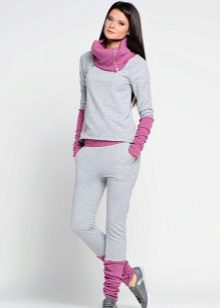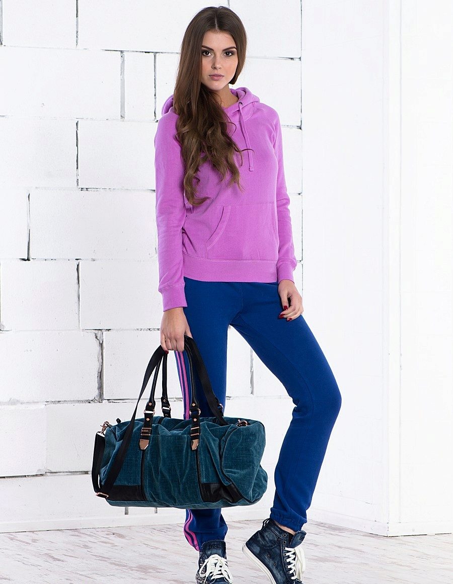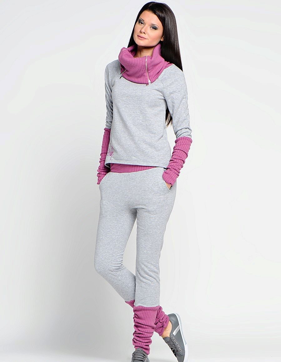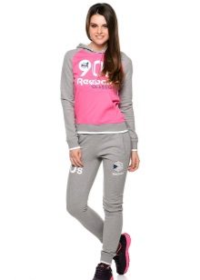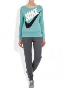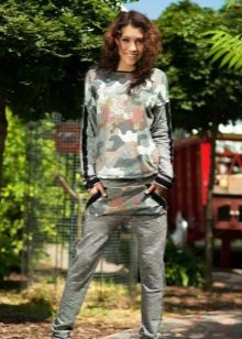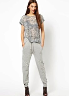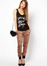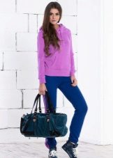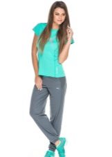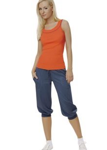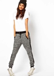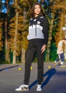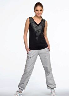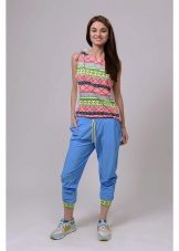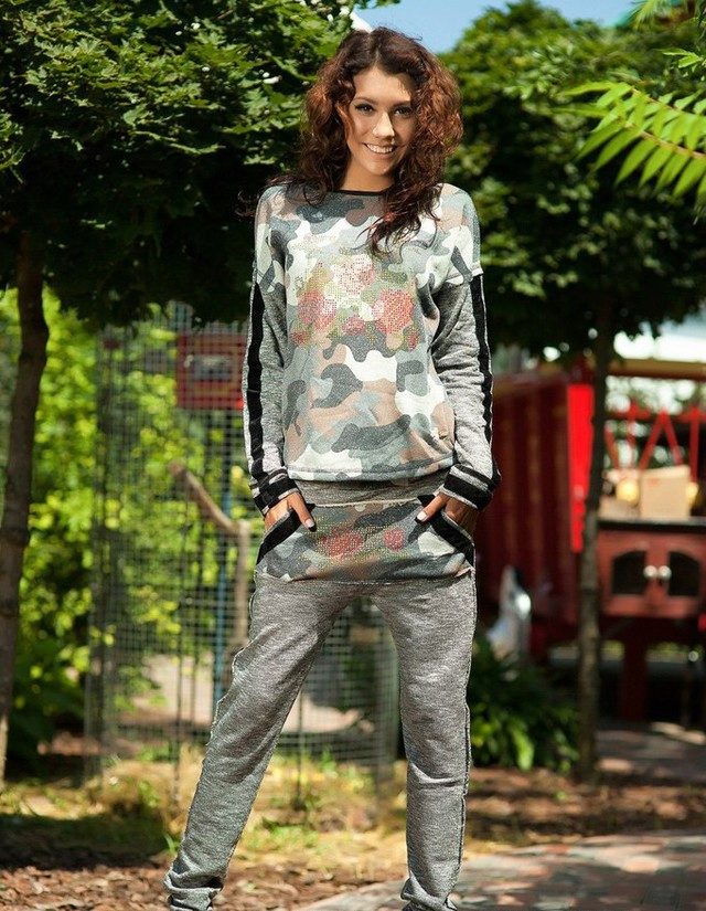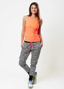 For a combination with loose sweatpants with elastic at the bottom, it is best to choose skintight things: tops, tank tops, sport tunics, windbreakers and sweatshirts over the figure. This image will look harmonious and neat, especially if we are talking about shortened styles with cuffs. More fitting pants can be worn with a volley-top - sweatshirts, hoodie, sweatshirts. If there is a bright print on the pants, for example, camouflage, then the accompanying clothing is best to be monophonic.