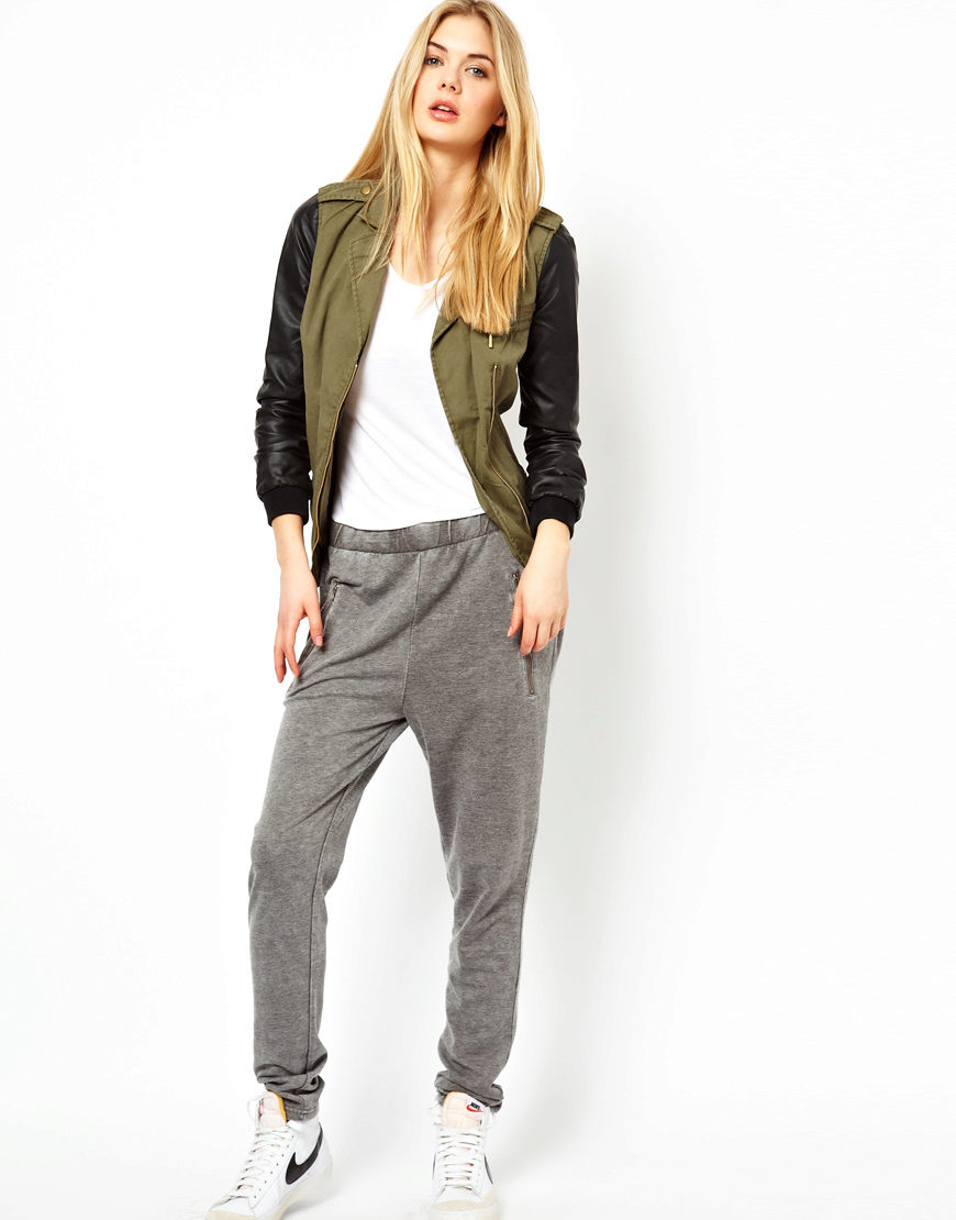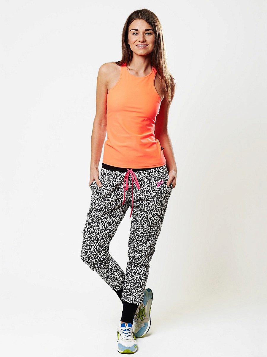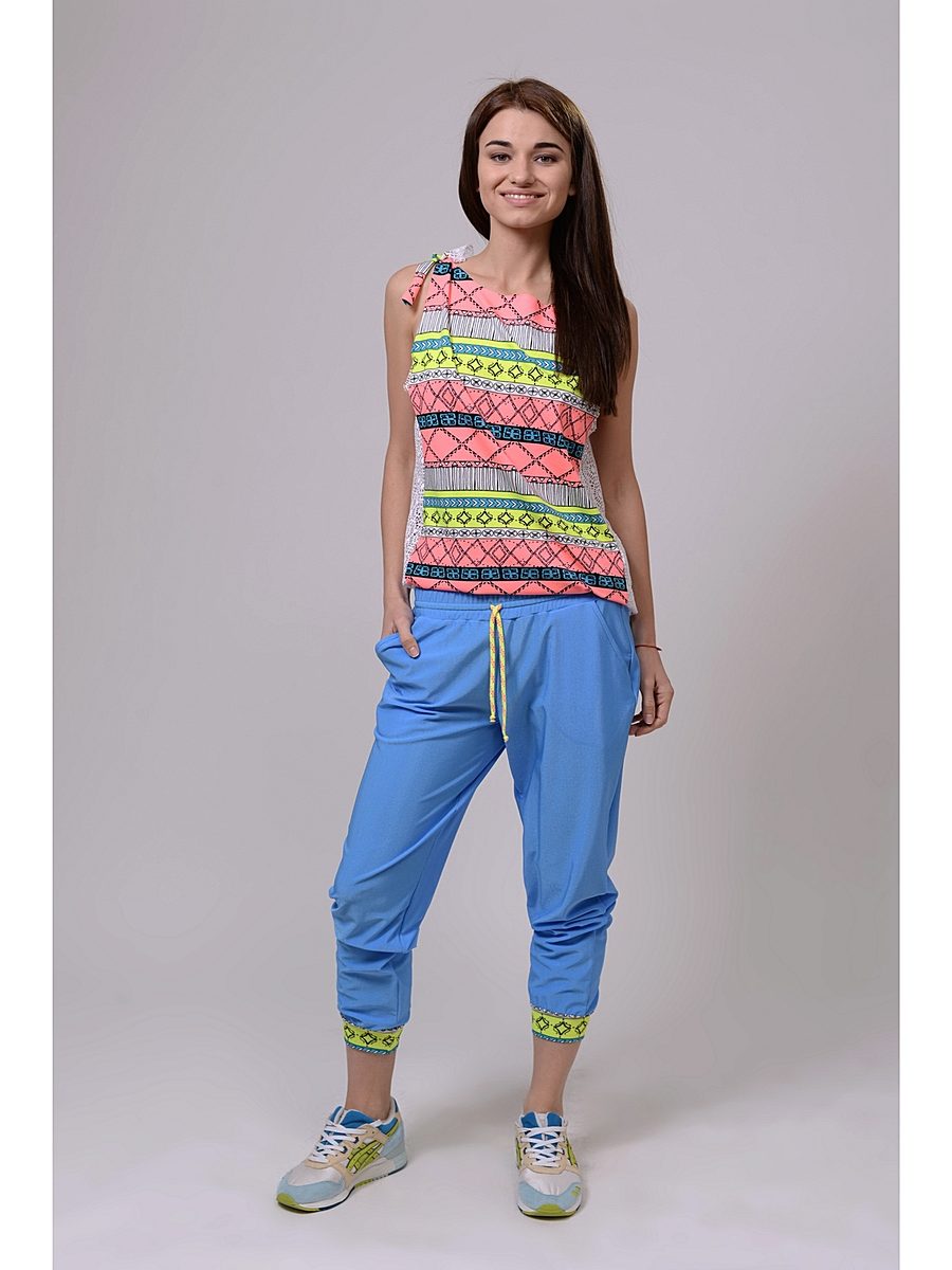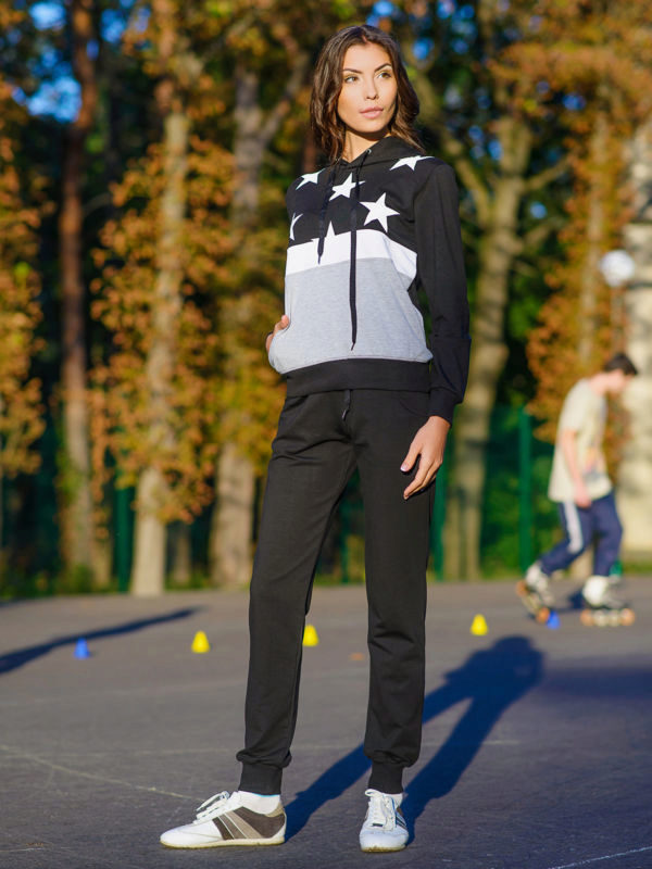 For a combination with loose sweatpants with elastic at the bottom, it is best to choose skintight things: tops, tank tops, sport tunics, windbreakers and sweatshirts over the figure. This image will look harmonious and neat, especially if we are talking about shortened styles with cuffs. More fitting pants can be worn with a volley-top - sweatshirts, hoodie, sweatshirts. If there is a bright print on the pants, for example, camouflage, then the accompanying clothing is best to be monophonic.