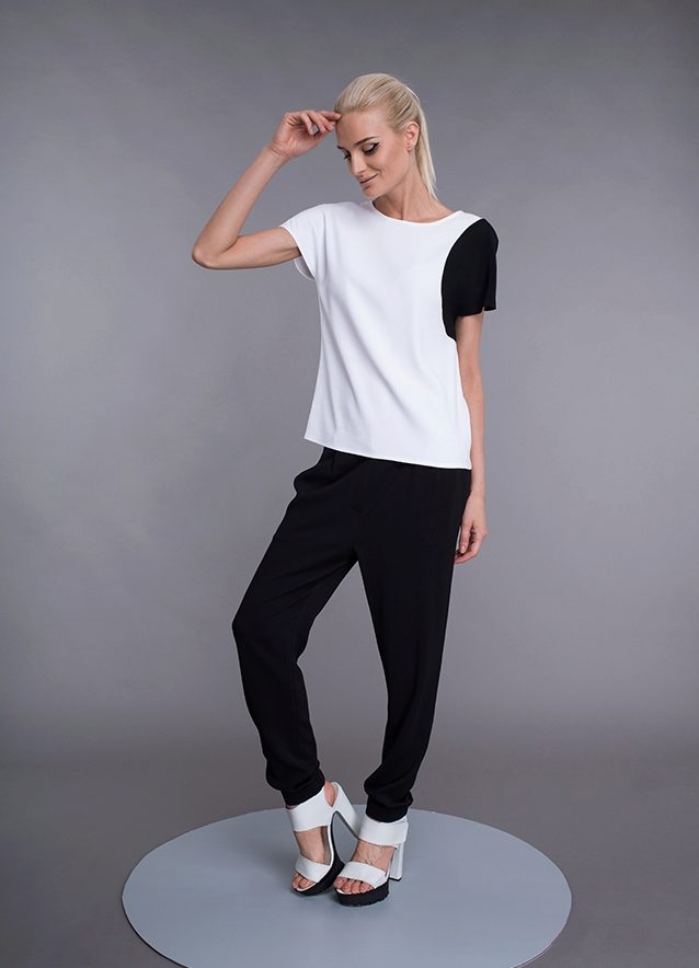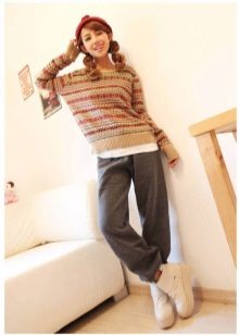 With sports pants you can create a contrasting image by combining them with a youth jacket and top or tunic under it. To do this, the pants should have a suitable style, less sporty, more casual, but they should include elements such as stripes, elastic laces on the belt.