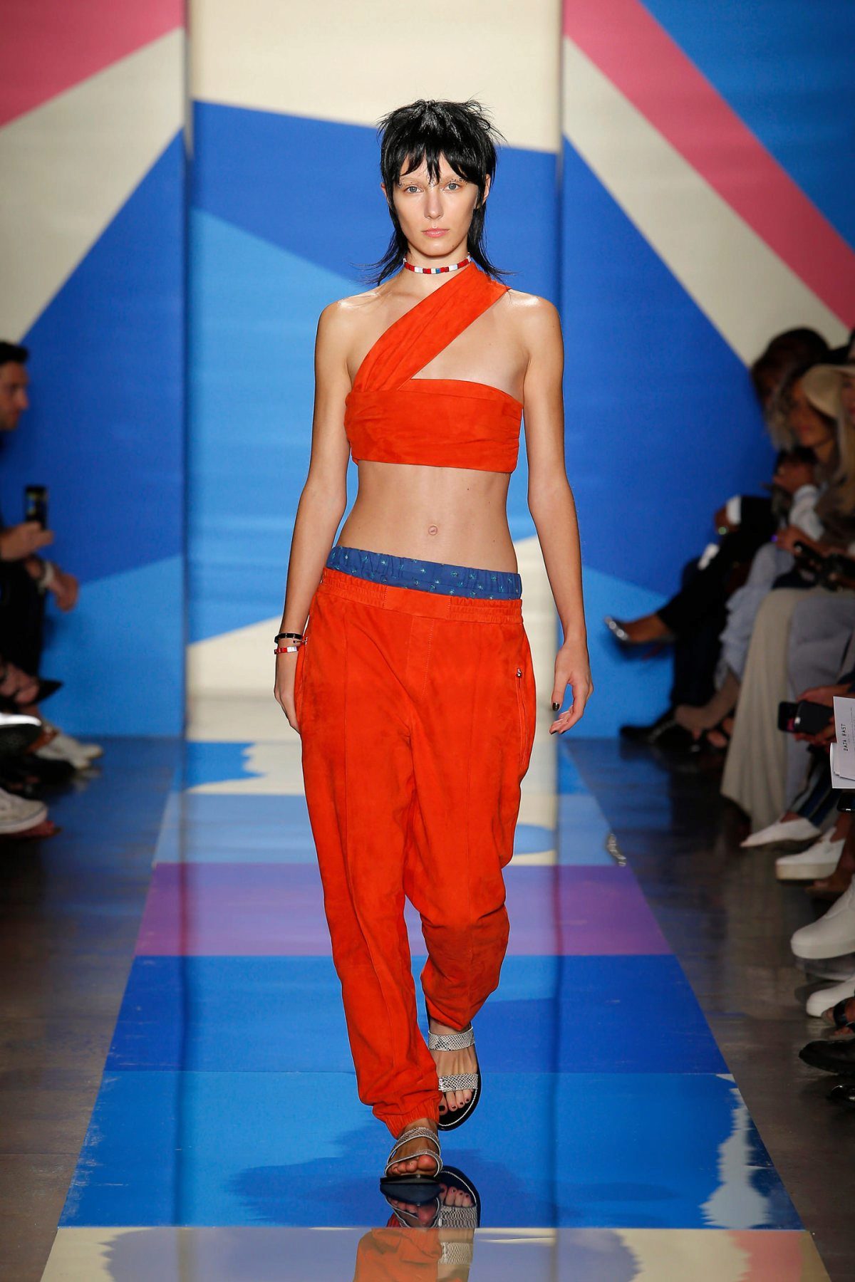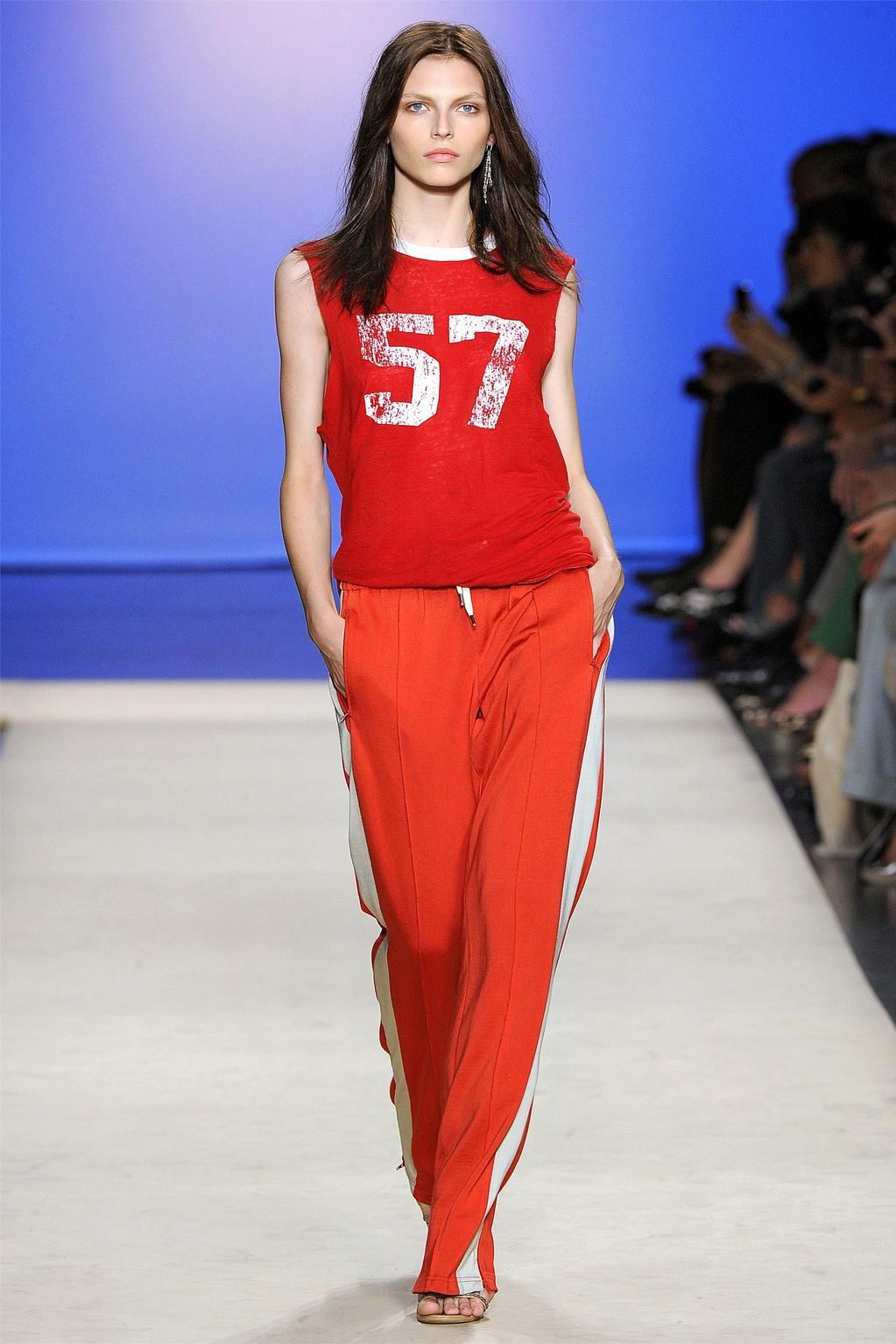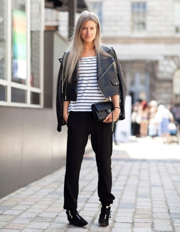 You can complete this look with low-key accessories in the form of bracelets or watches, as well as low-top sneakers, in color close to the shade of sports pants.