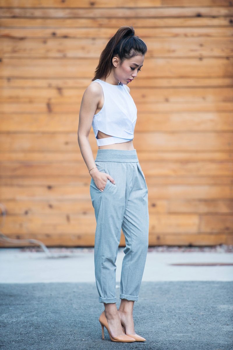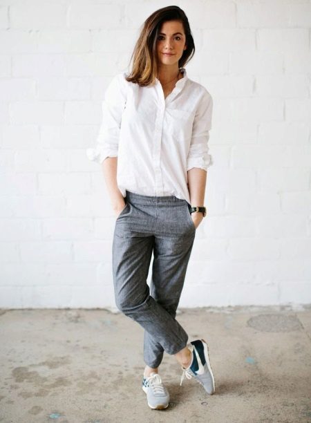 Gray sweatpants with elastic at the ankles can be combined with a completely ordinary cotton white shirt, and this combination will look very interesting and fashionable.