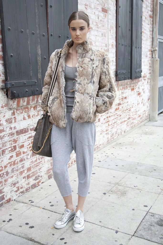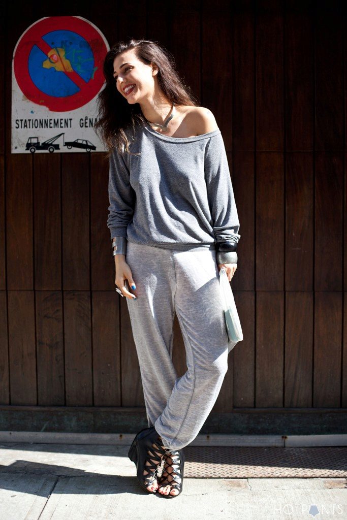 In everyday life in clothes, convenience and comfort are most valued, especially if you have to walk a lot and move around the city during the day. A combination of light gray knit sweatpants with ankle elastic and a lightweight knit long-sleeved t-shirt of the same color will be an excellent, stylish and at the same time comfortable option.