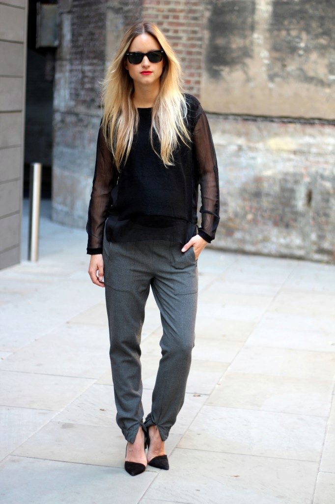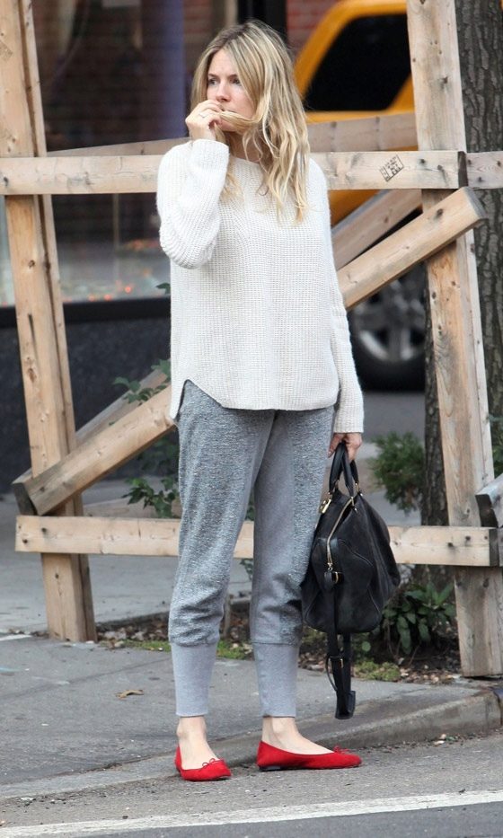 A lover of shoes with heels should not despair, because for them there is a rather interesting version of the combination of sports pants with shoes. For example, if you take all the same gray sports pants, but this time the narrowed cut, to complement them with a cotton classic shirt and black boats with a low hairpin, you get a very elegant and even feminine combination.
