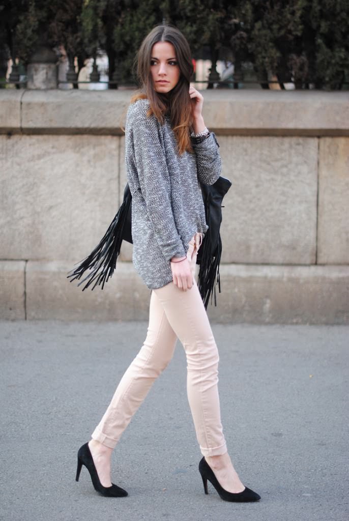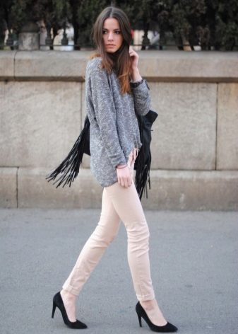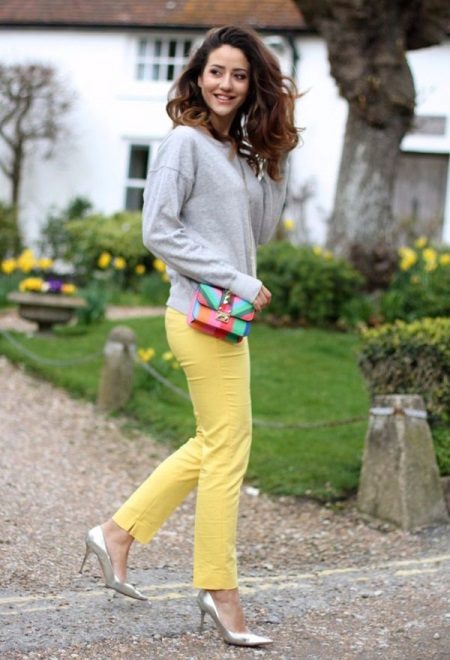 - Yellow skinny pants and a gray knit sweatshirt for a cool summer. A small leather handbag on a chain is able to add color. Silver bow pumps will complete your bow.