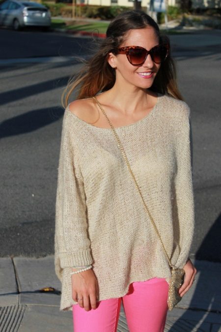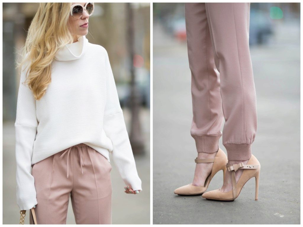 - Blend tight pink trousers with a champagne-colored shirt. Dark shoes, such as ankle boots, help to make the image harmonious.