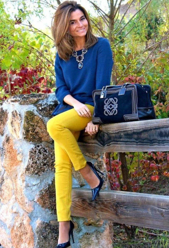- Blue These pants are relevant in the warm season. Depending on the shade of blue, these pants can be combined with a mint, blue, white or pink top.