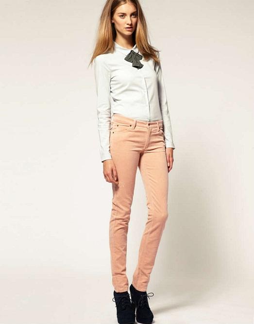 - Pink and beige corduroy trousers and a white shirt for a casual look. Wear a dark bow and black lace-up ankle boots to be bright.