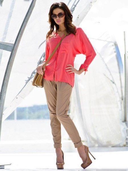 - Beige. To harmonize the bright top, for example, turquoise, coral or orange can beige pants.