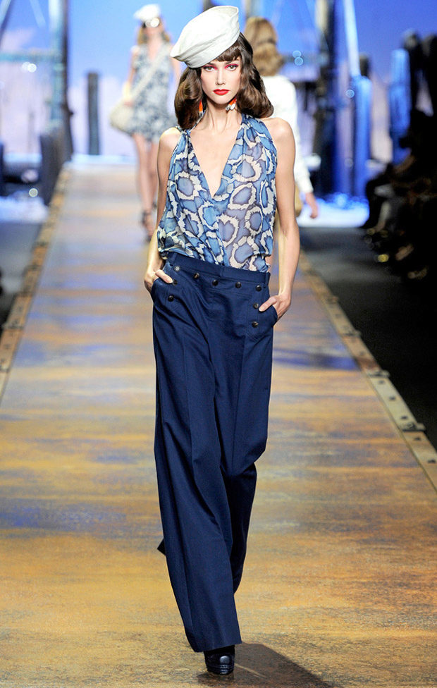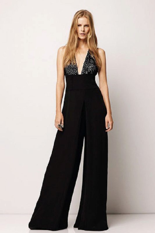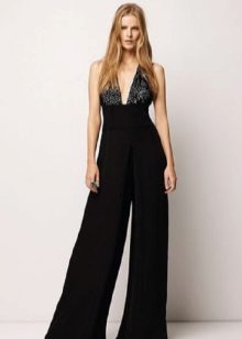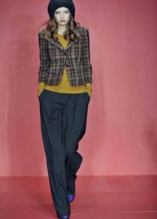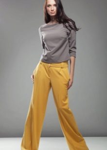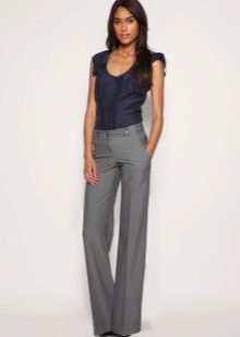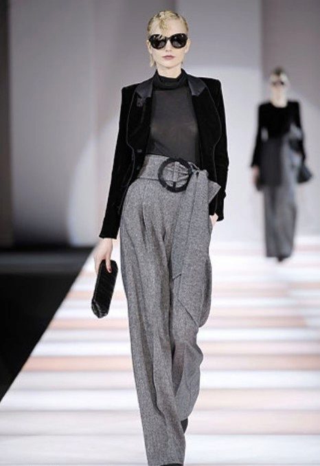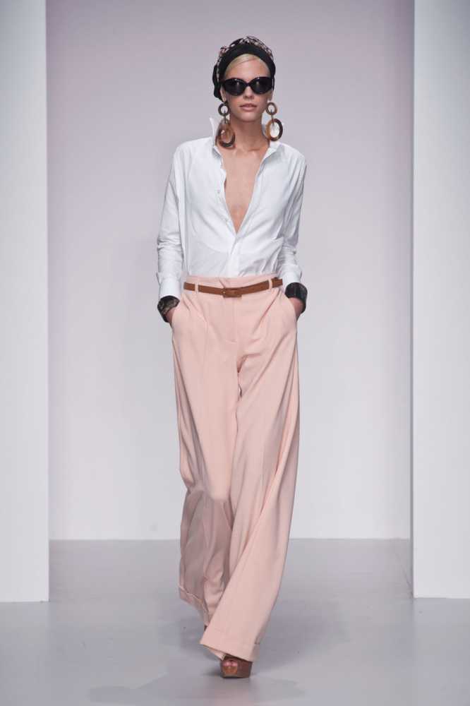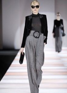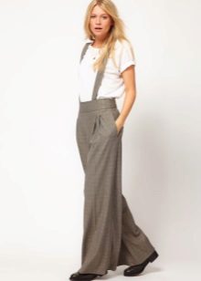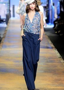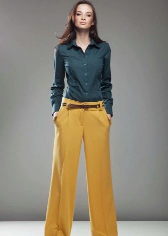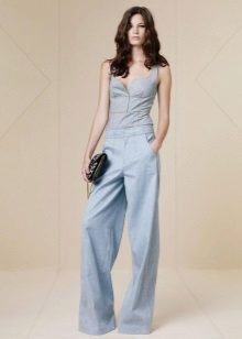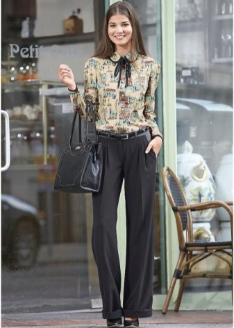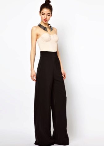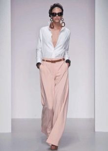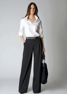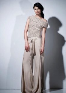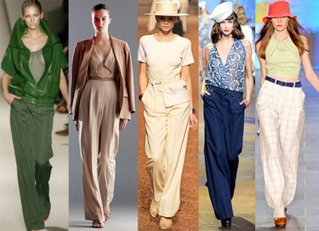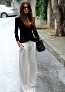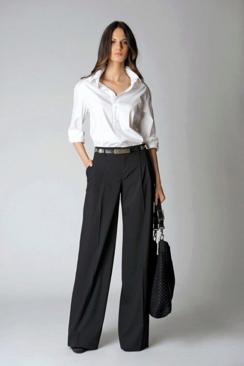 Wide trousers look particularly good with a top that exposes the arms, back and shoulders. If the figure allows, you can wear a shortened model that will show those around you with a flat tummy. This is called a game of contrasts, wide baggy pants and a stylish tight top look very interesting. To make the image look very laconic, add interesting accessories to it.
