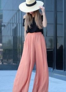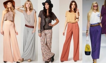This is a model of very loose pants, which looks like a skirt to the floor. They are distinguished by a high waist, which makes the figure particularly feminine and sophisticated. They are usually sewn from lightly flowing fabric — silk, chiffon, or fine cotton. This model will allow you to successfully mask all the flaws, give the image elegance and lightness.