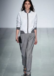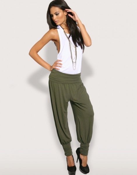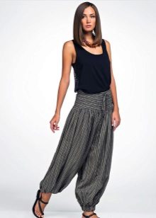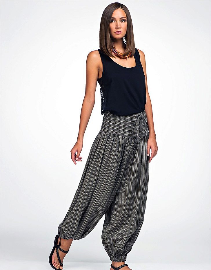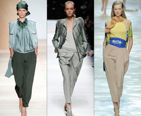 Wide trousers in oriental style, which are gathered at the ankle with a wide or narrow cuff. Often they have a low armhole, so they look very interesting and unusual. It is also oval-shaped pants that fit only slender girls. Despite the fact that they perfectly hide figure flaws, they also add a few extra pounds.