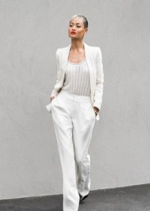 Perfect business look. A blue trouser suit, which consists of wide trousers in a masculine style and a blue fitted blazer. The image is complemented by a classic white shirt and a small clutch bag, which can be replaced with a bulky bag. Cobalt shade attracts the attention of others, so you just will not go unnoticed.
