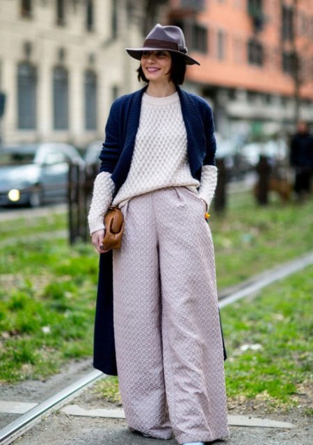 A bold look for every day for real fashionistas! Light gray palazzo trousers in combination with a voluminous white sweater and a long blue cardigan look very interesting and unusual. It is complemented by a small brown handbag and a stylish gray hat. In this case, the girl chose sandals, but it is better to prefer sneakers in sports style, loafers or oxfords.