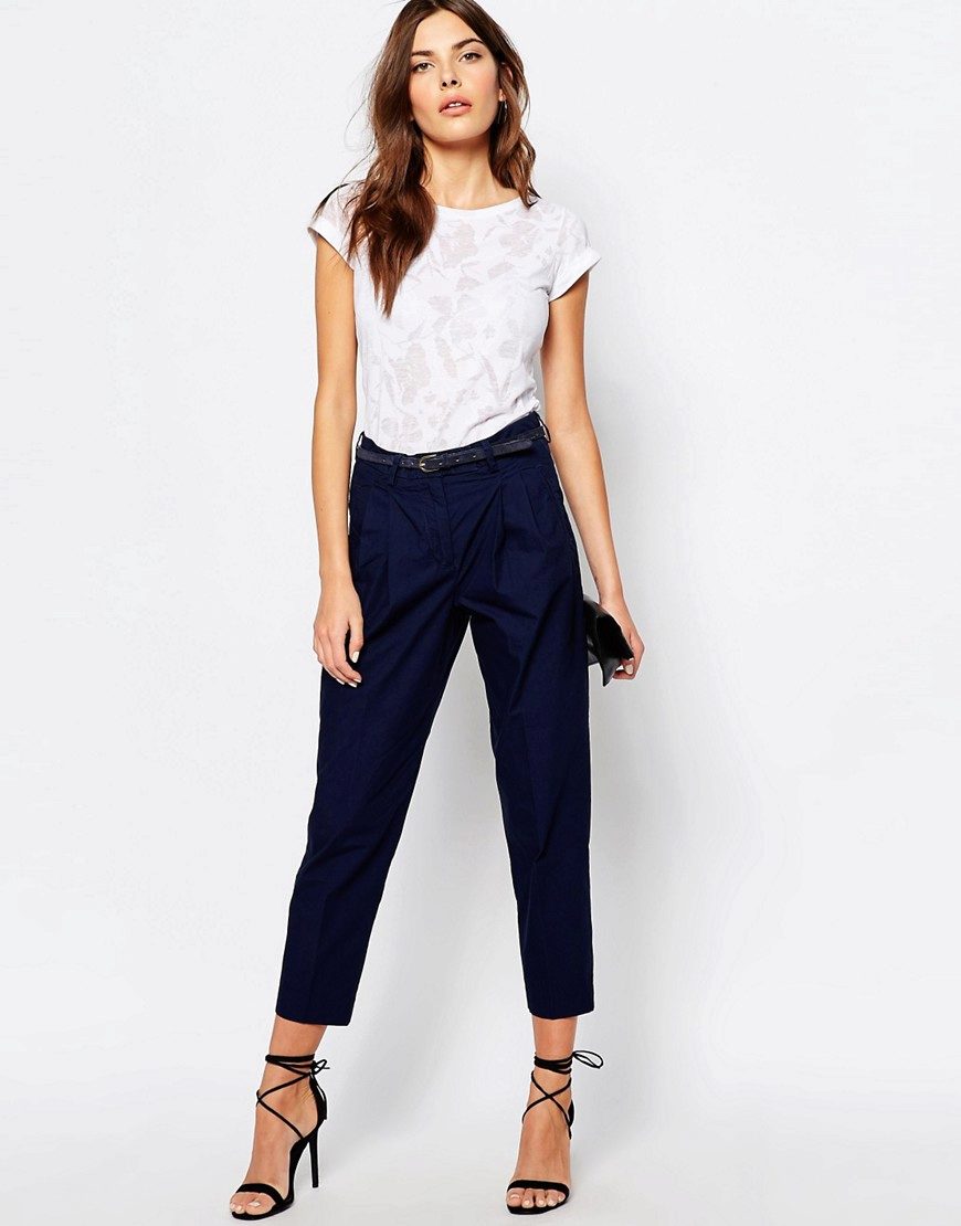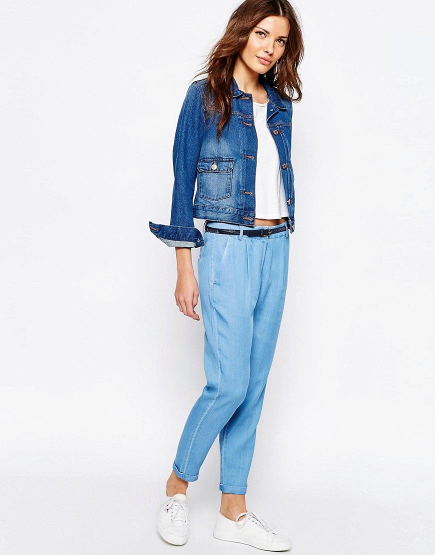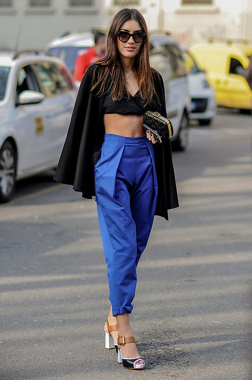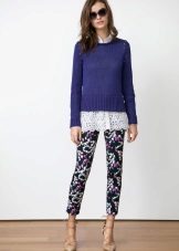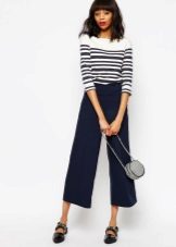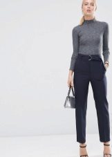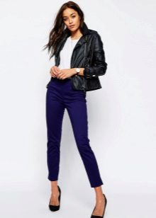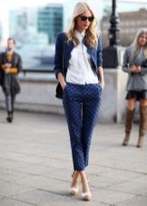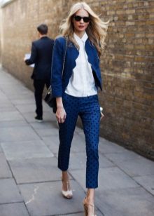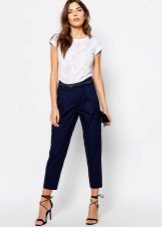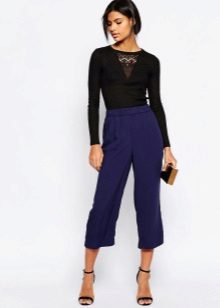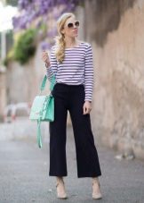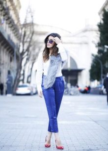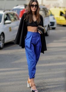 Cropped trousers of a dark blue shade can become the basic thing of a wardrobe, they can safely go to work, combining with a neutral color scheme. For everyday wear, blue pants can be worn with brown and white clothes. Bright blue pants, combined with bright accessories, are suitable for a fashionable party.