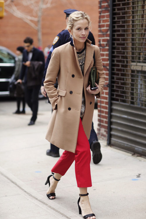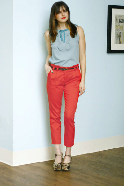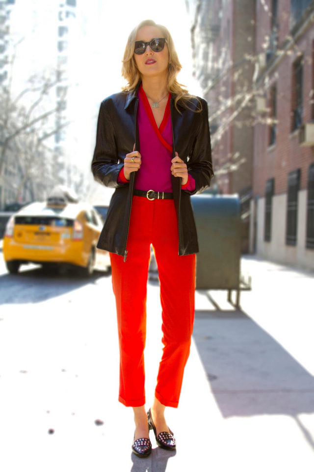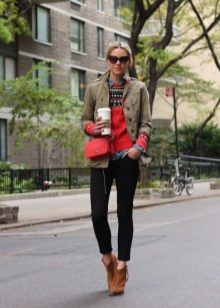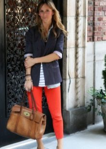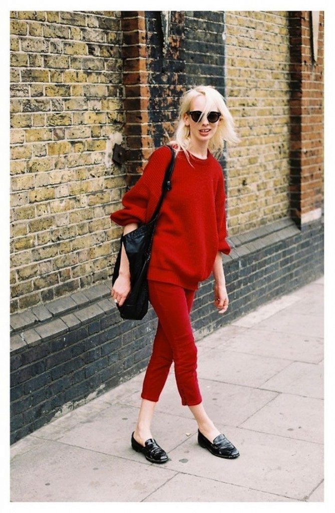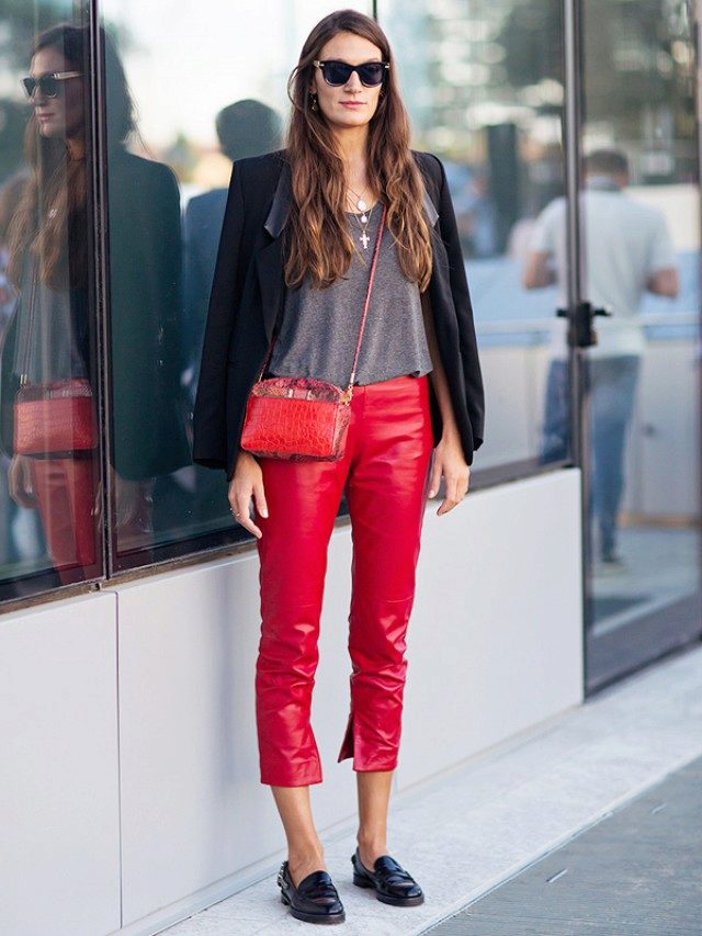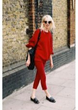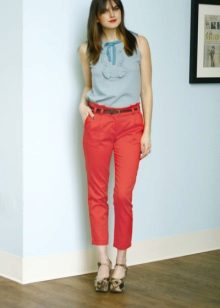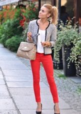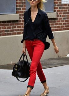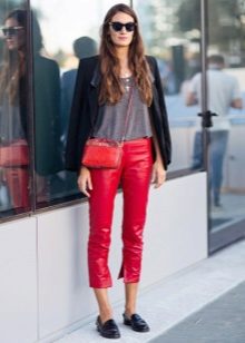 Red cropped trousers are best combined with a neutral color scheme - white, beige, black, dark blue and gray. Wear red trousers with shirts, blouses, jackets, or jackets for work. Skinny pants in red will be interesting to look in casual looks, in combination with a t-shirt and leather leather jacket.
