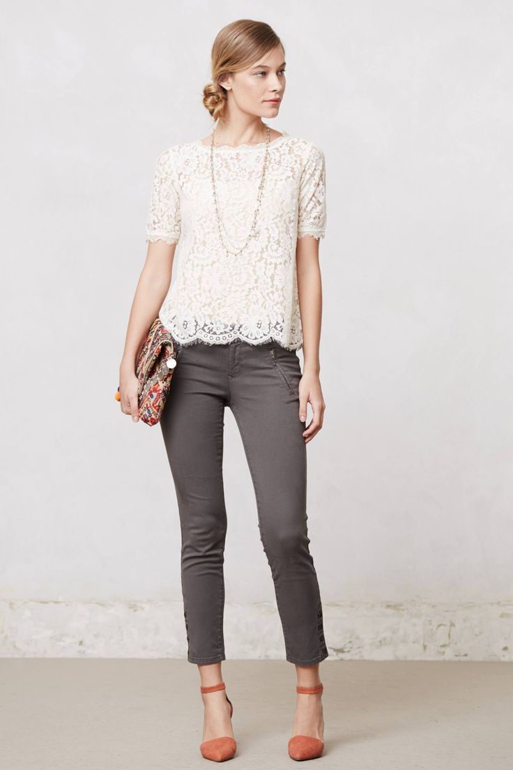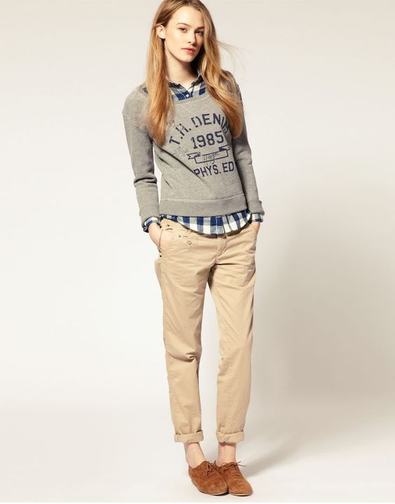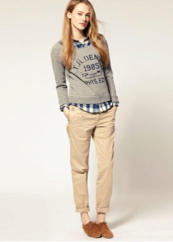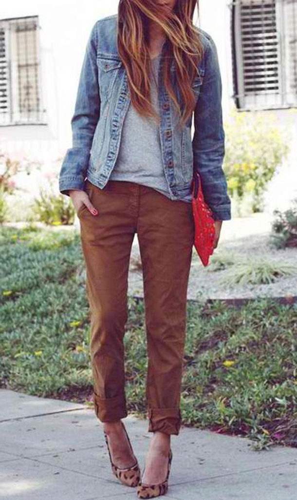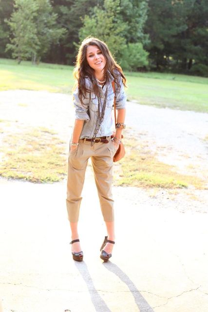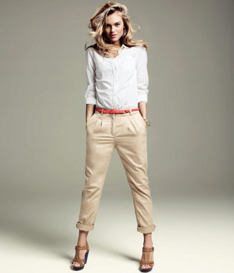 Slender girls of medium height should prefer pants that end a couple of centimeters above the ankle. Chinos pants are a great solution. It is best to wear them with a high heel to visually stretch the silhouette.