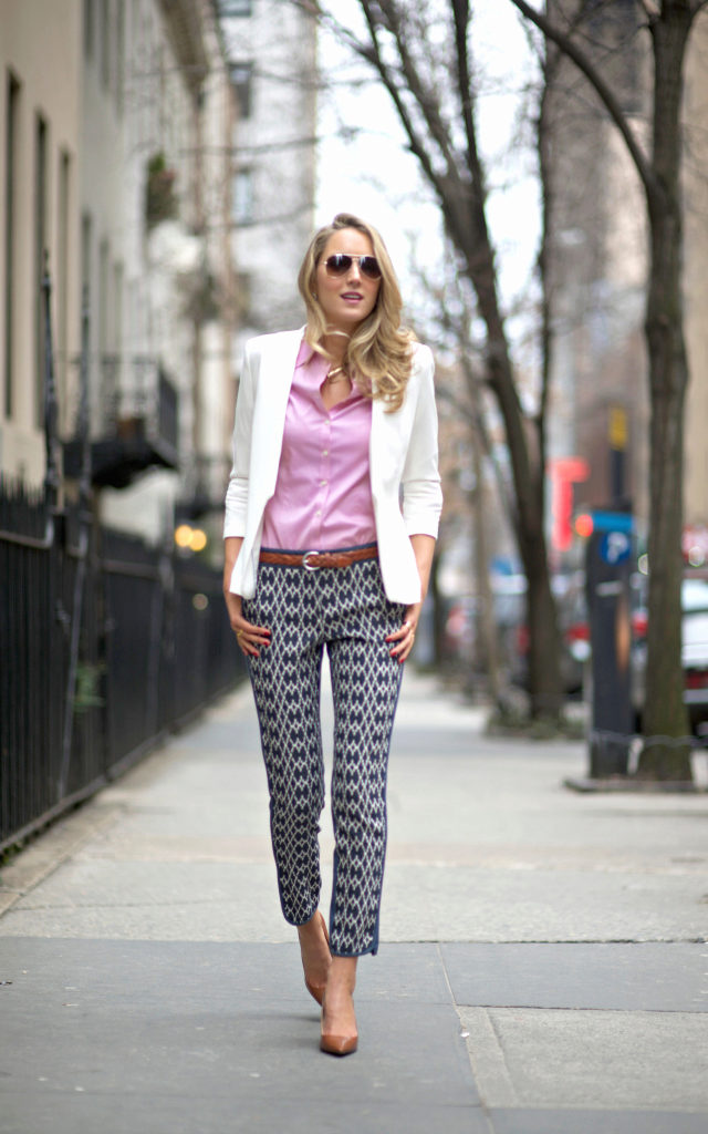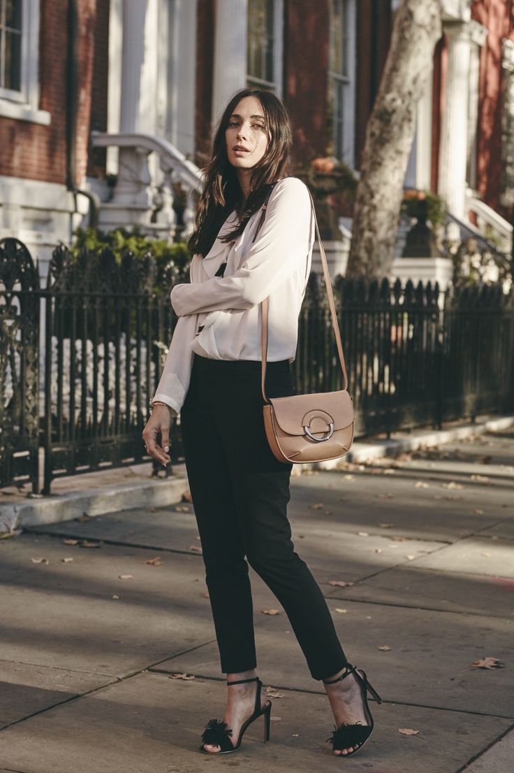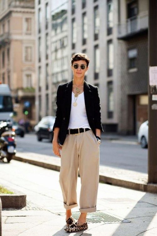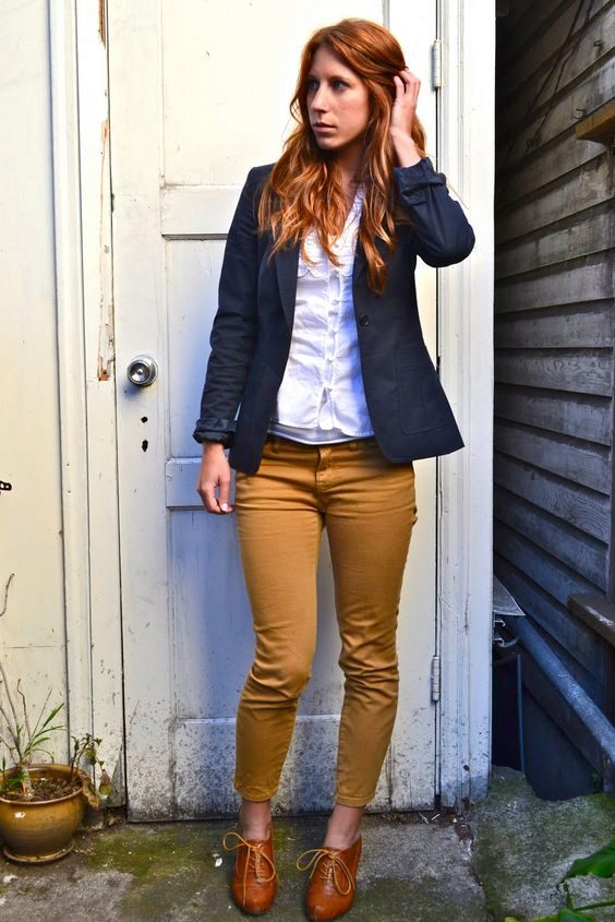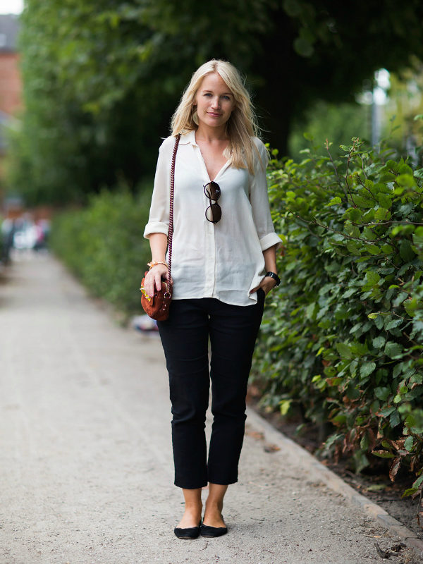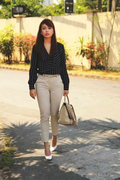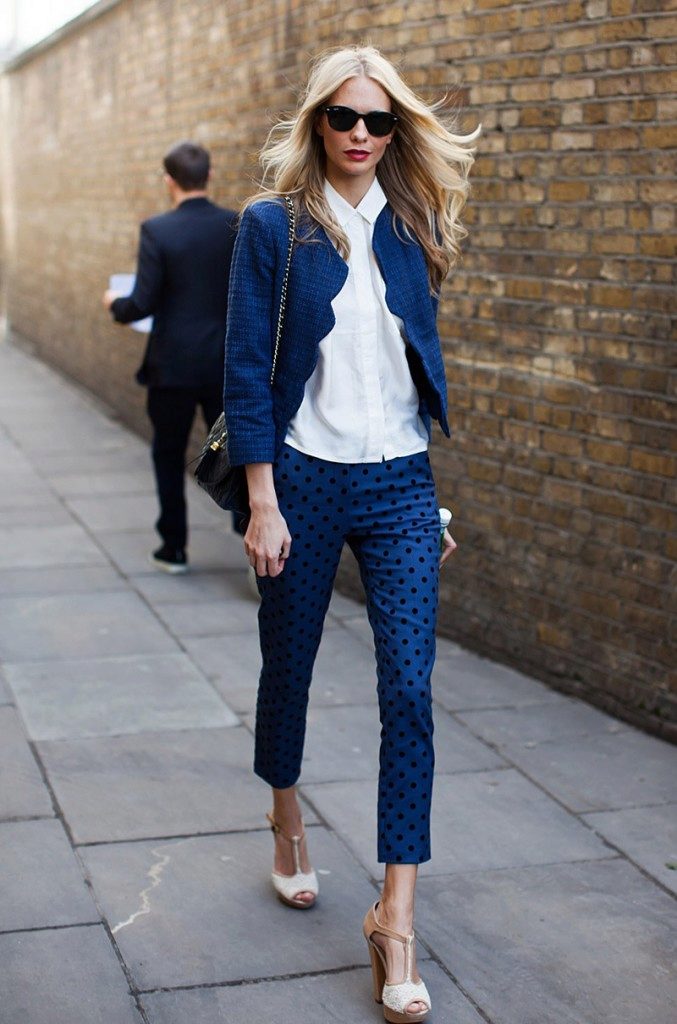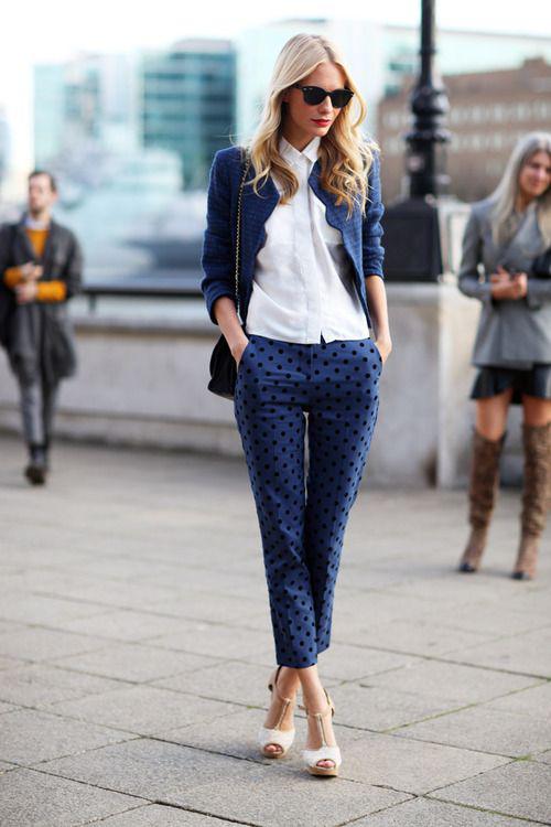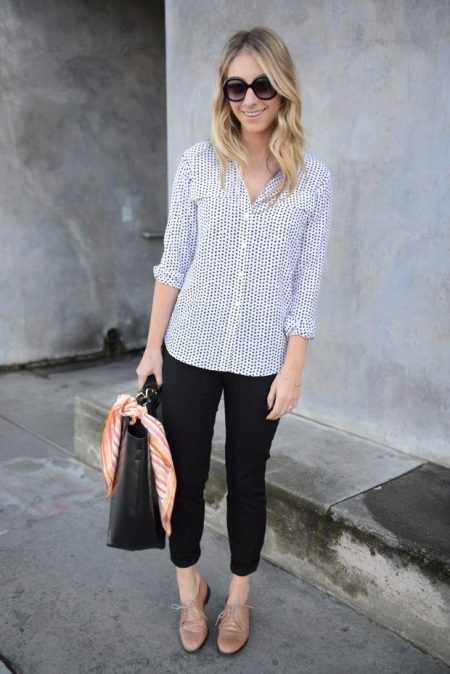 This look will fit into any, even the most strict dress code. Executed in strict minimalism, it looks elegant and stylish. A white shirt with black polka dots can be tucked into pants and a blazer can be thrown on top. And if you are not tall, replace beige oxfords with pointed toe pumps.