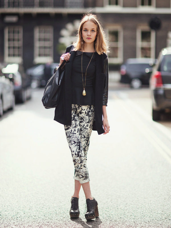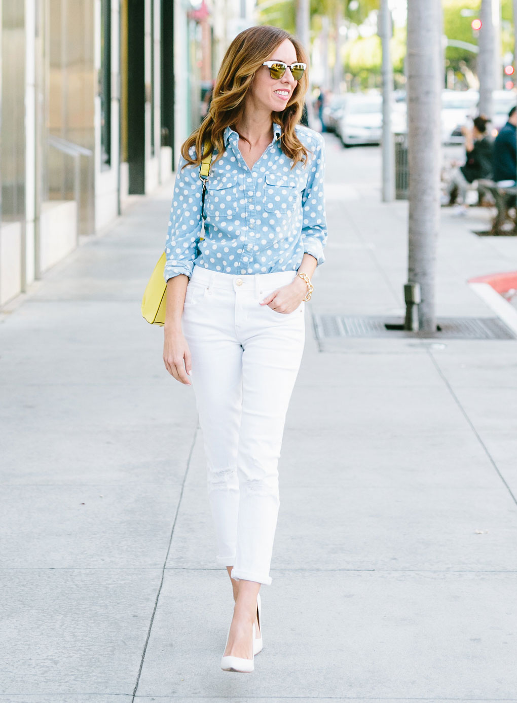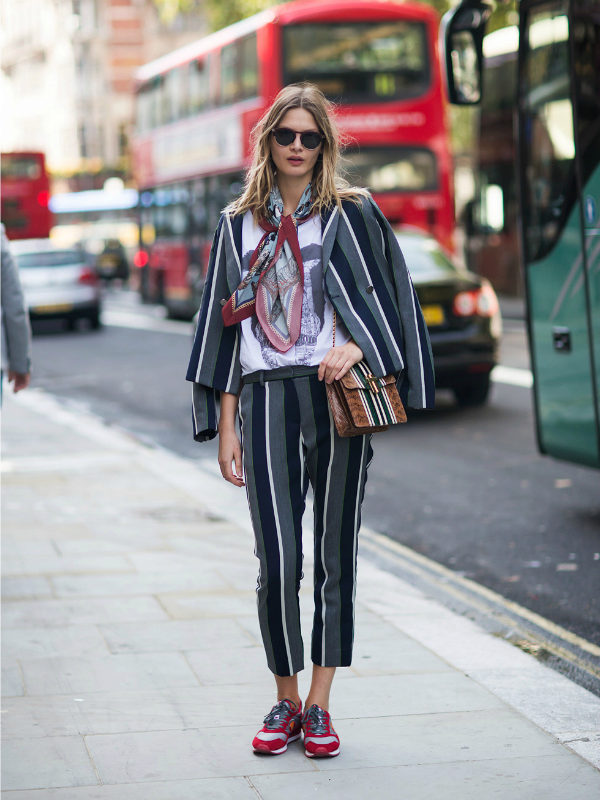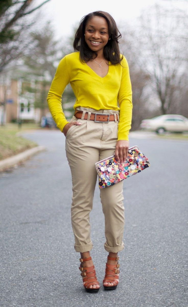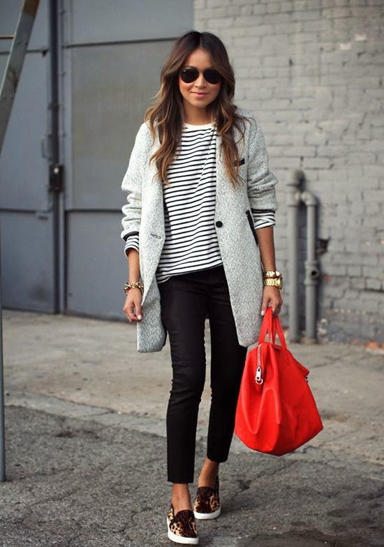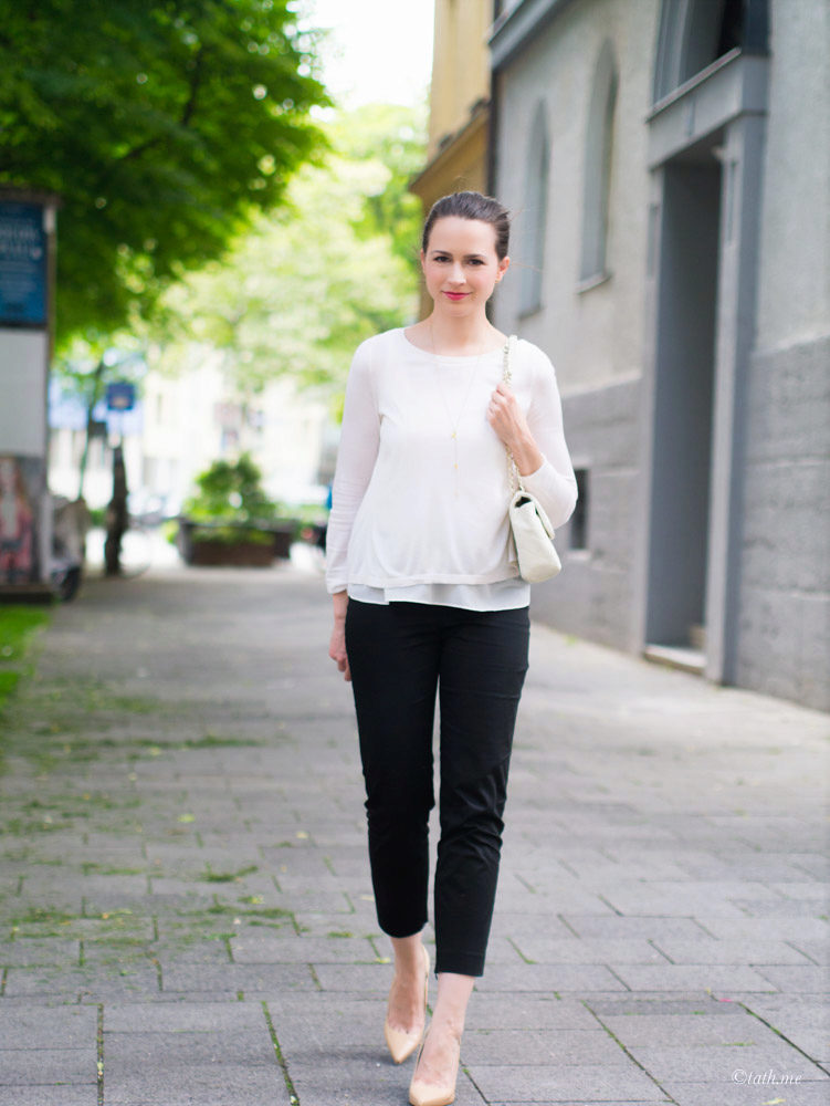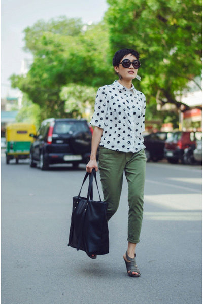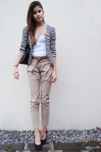 This look will fit into any, even the most strict dress code. Executed in strict minimalism, it looks elegant and stylish. A white shirt with black polka dots can be tucked into pants and a blazer can be thrown on top. And if you are not tall, replace beige oxfords with pointed toe pumps.