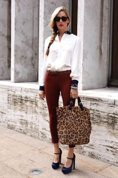 Brown trousers are suitable not only for business, but also romantic or everyday images. They are perfectly combined with clothes of white, black, blue color which ideally fit into an office dress code.
