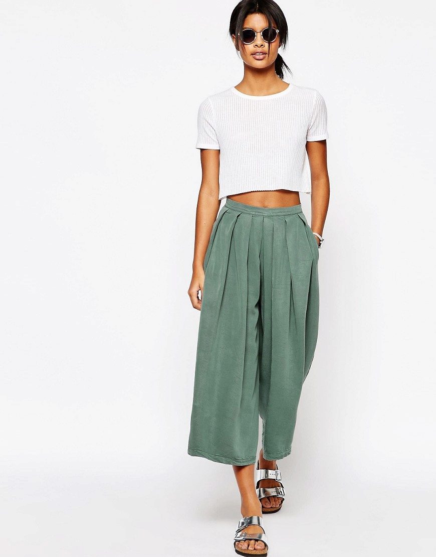 Recently, culottes, wide, cropped trousers, have become very popular.