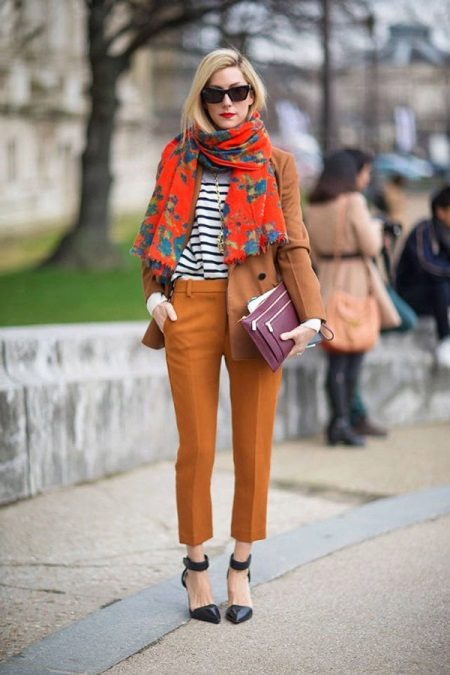 Almost universal image, which is suitable for work (provided that you do not have the strictest dress code), breakfast with friends or a fashionable party. Look is made in soft caramel and coffee color, which helps to dilute the monochrome vest tucked into the pants. A bright accent is a red scarf with a floral print. Complement the image of the boat with heels and a stylish purple clutch.