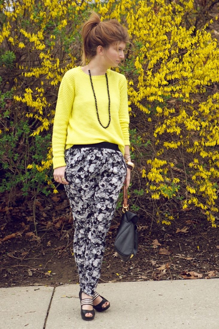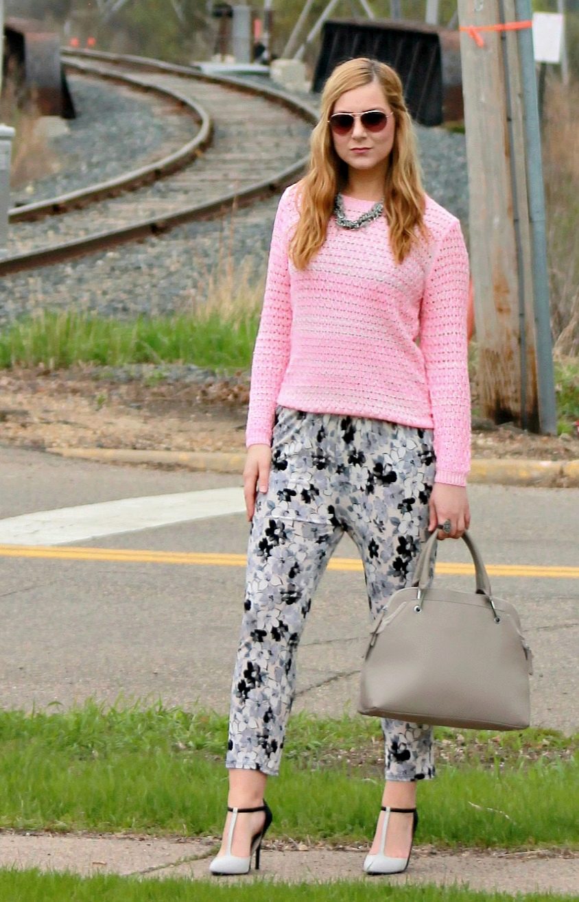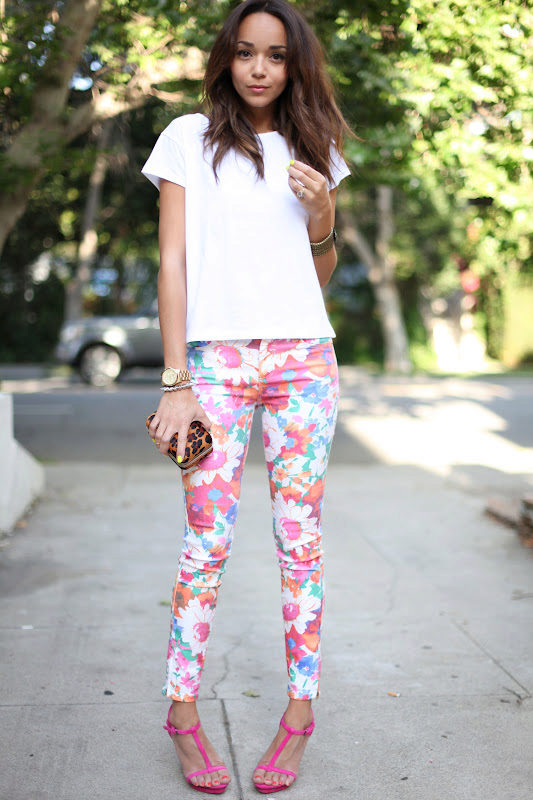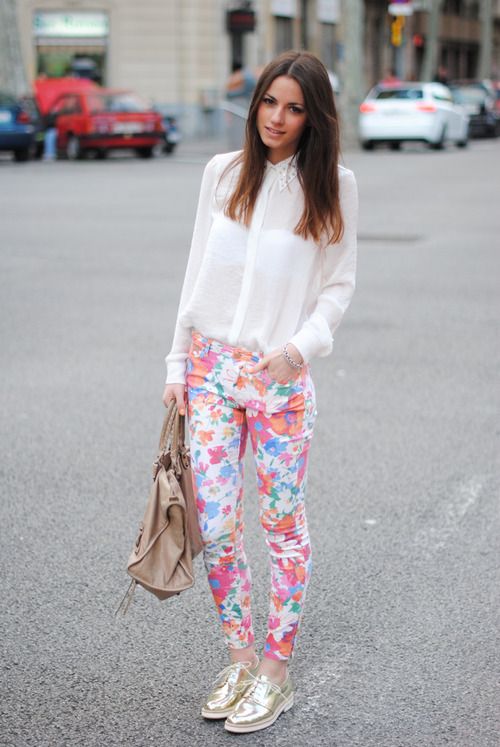 Floral print pants are already your main accent in the image. They will undoubtedly attract the attention of others, so the best option would be a separate top.