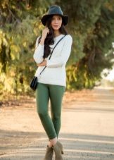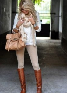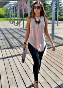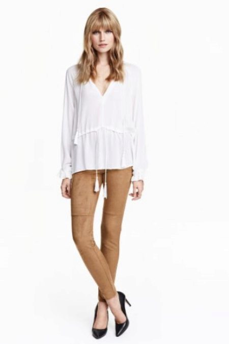 Leggings sand color, suede material + white stylish blouse. At first glance, a simple but harmonious image, giving ease. Add classic black pumps.