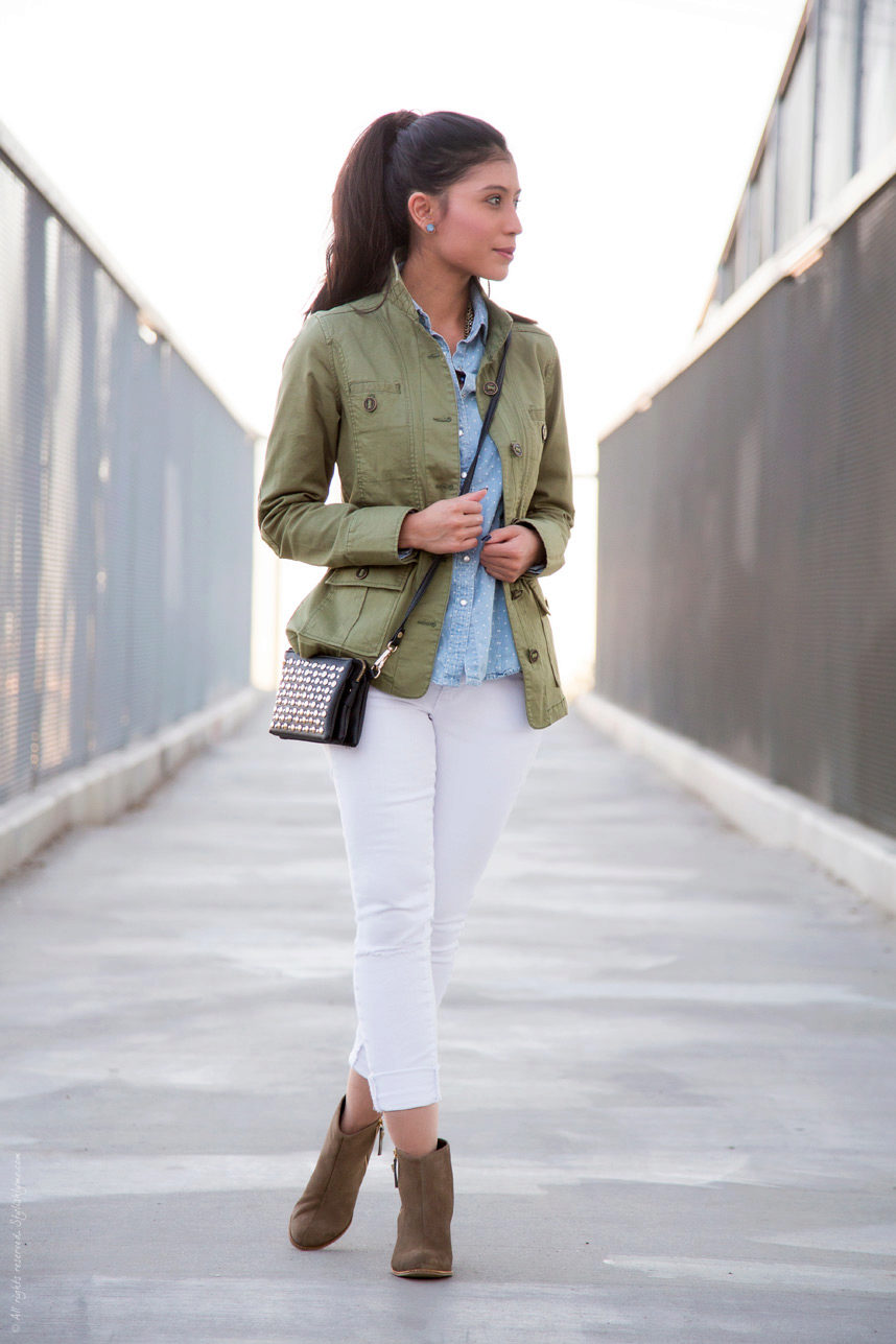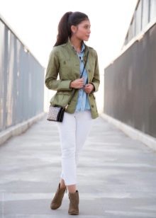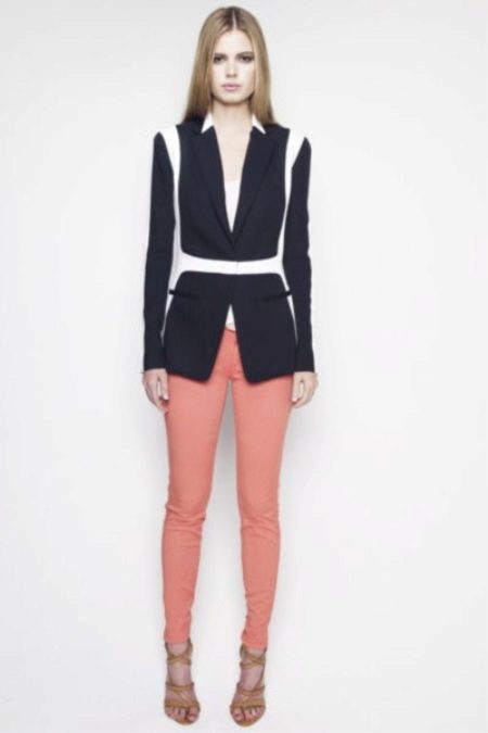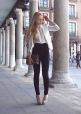 Pants skinny + elongated jacket. A bright shade of trousers in combination with a white top and a classic black and white jacket. Sandals neutral beige color. This image is suitable for study, a date or work, if you do not have a strict dress code.