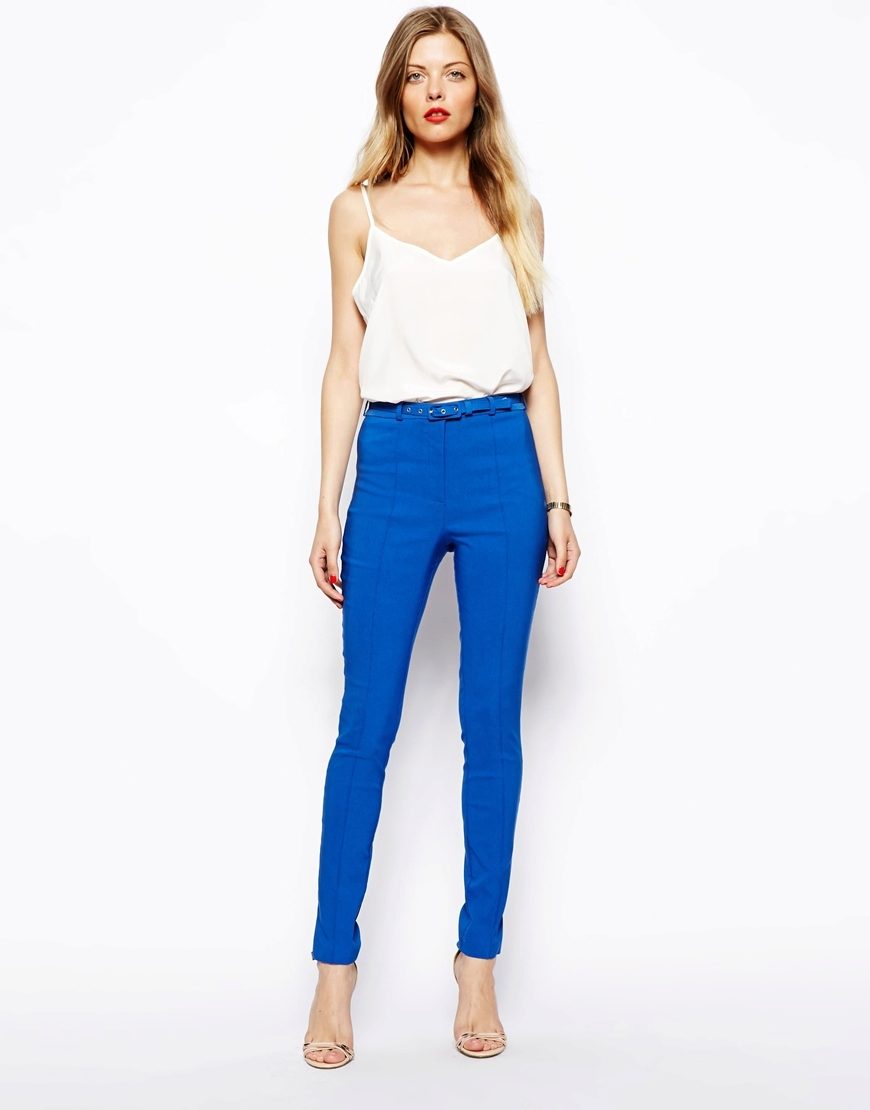 Tight-fitting pants with a high waist + white top. Spectacular image of bright blue pants, tight-fitting figure in combination with a monochromatic white T-shirt.
