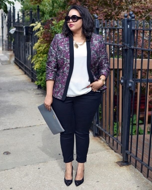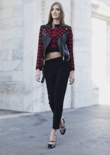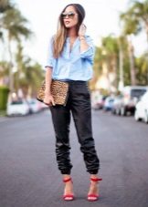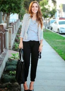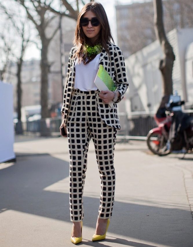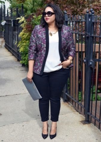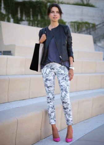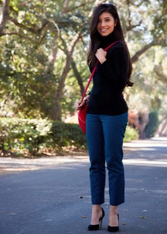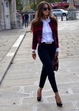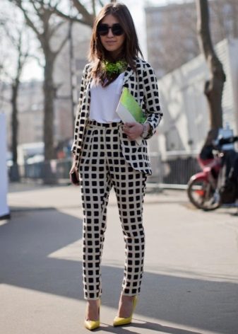 A stylish suit with narrowed trousers is impossible without properly selected accessories. There is enough one bright detail - a beautiful bag, original glasses, a massive necklace or an unusual hat.