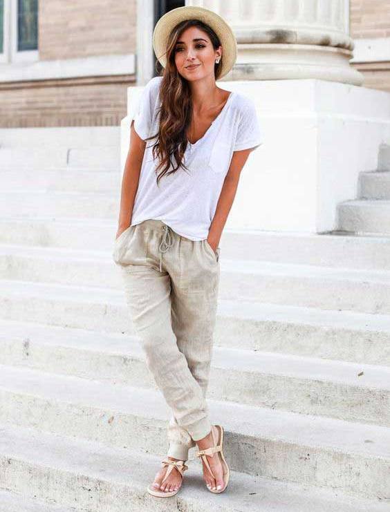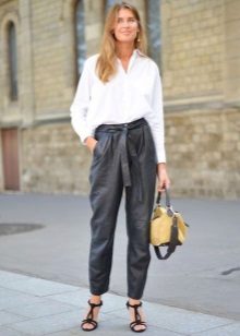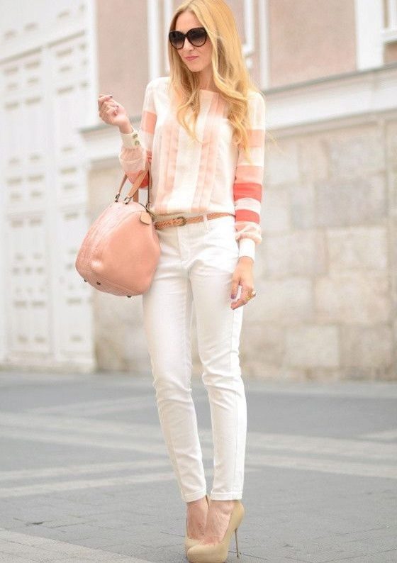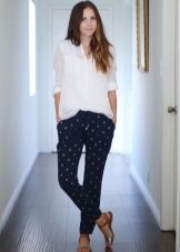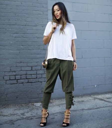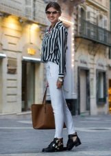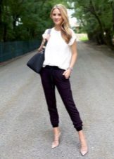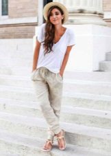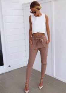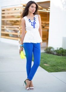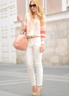 White pants narrowed silhouette - an impractical thing, but very spectacular, especially in summer when it sets off tanned skin. Snow-white trousers look great with bright tops and shoes.