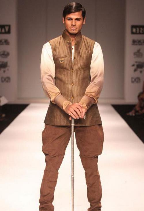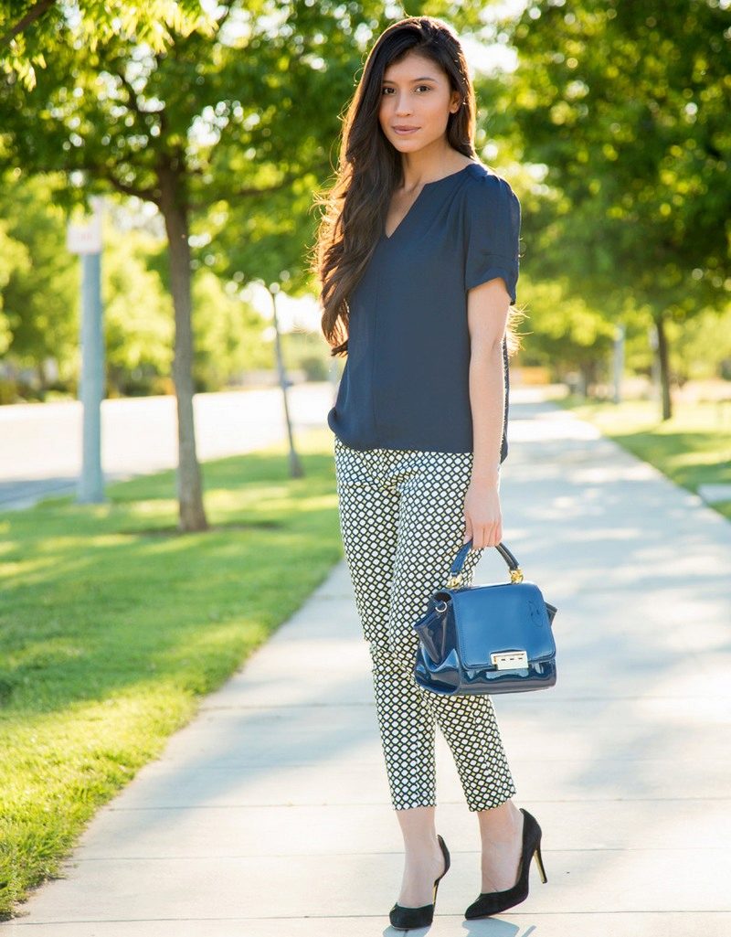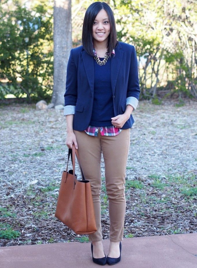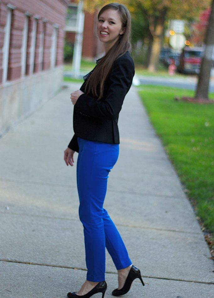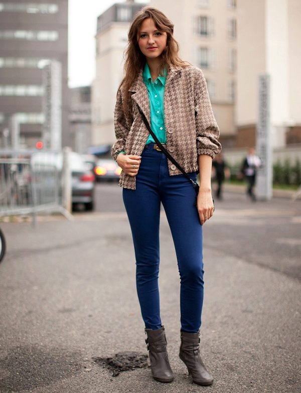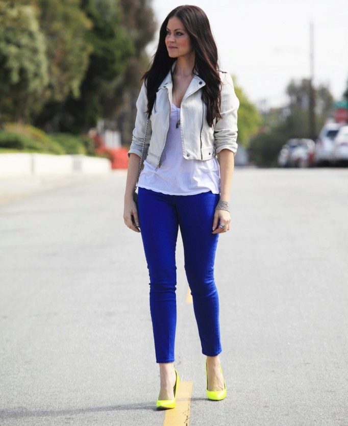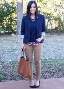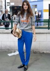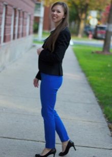 Blue pants can be an option for both business and casual wear. They are truly versatile, so they are perfectly combined with a strict jacket, and with a striped top vest.