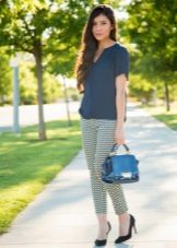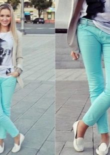 - Bright casual bow: turquoise pants, the same color bag, t-shirt with a print, light jacket and snow-white moccasins.