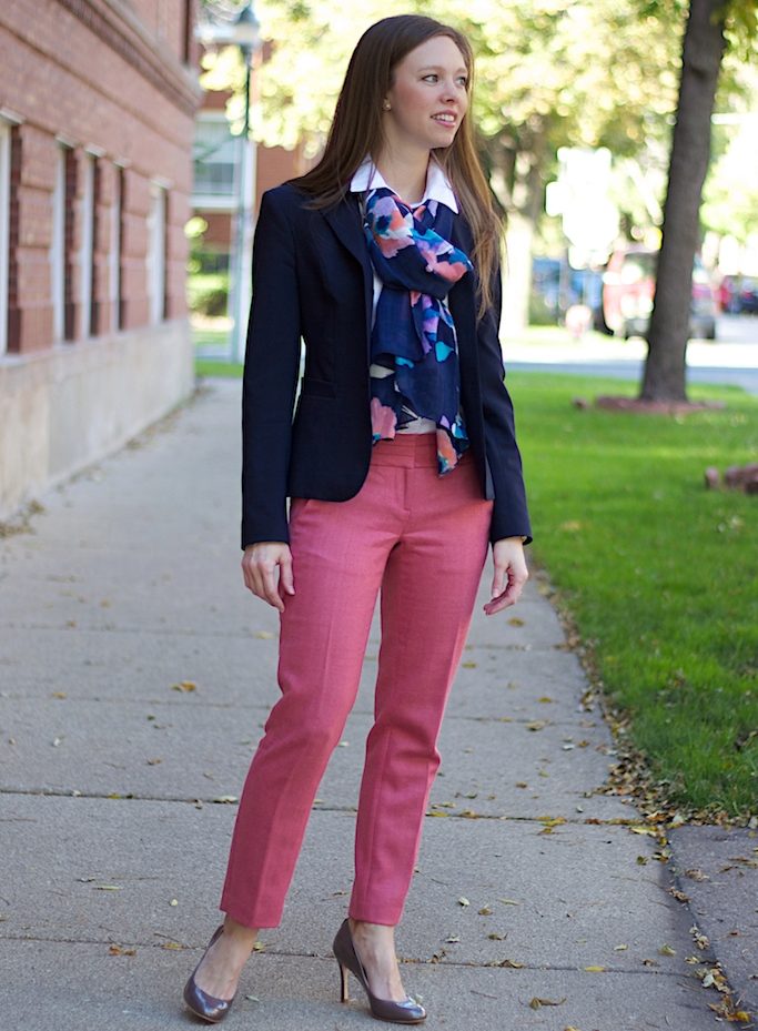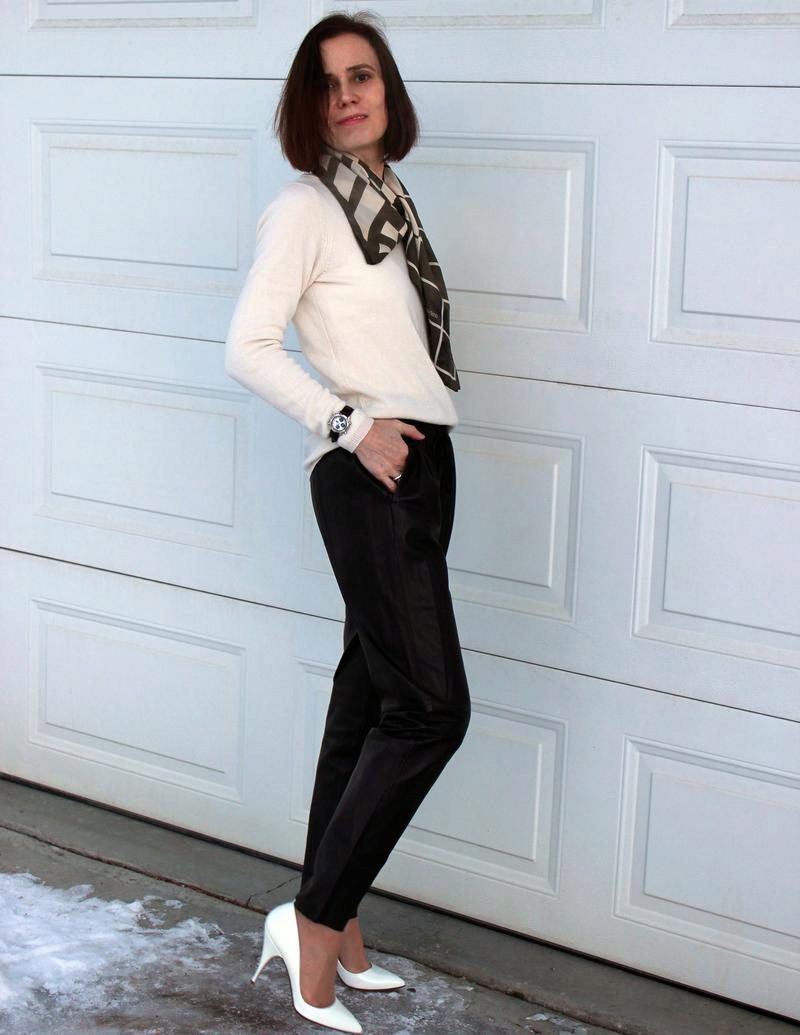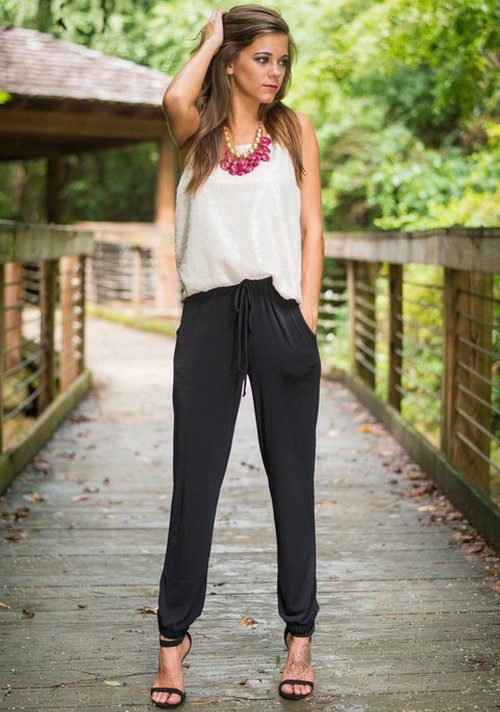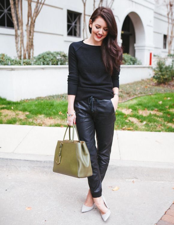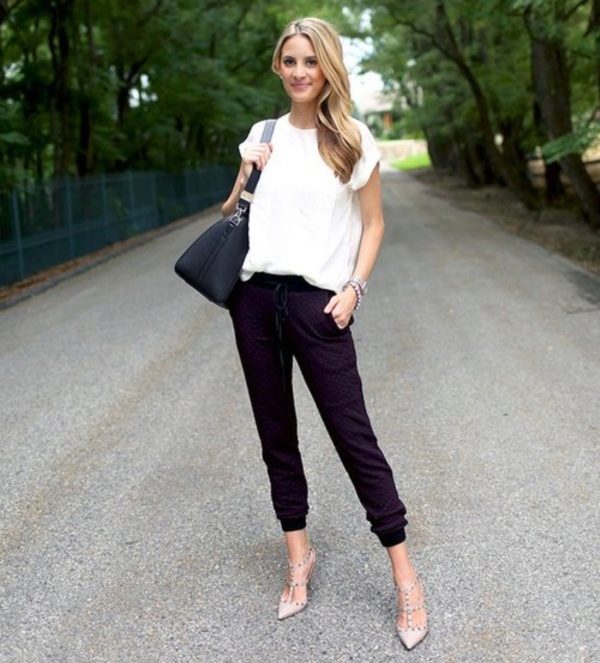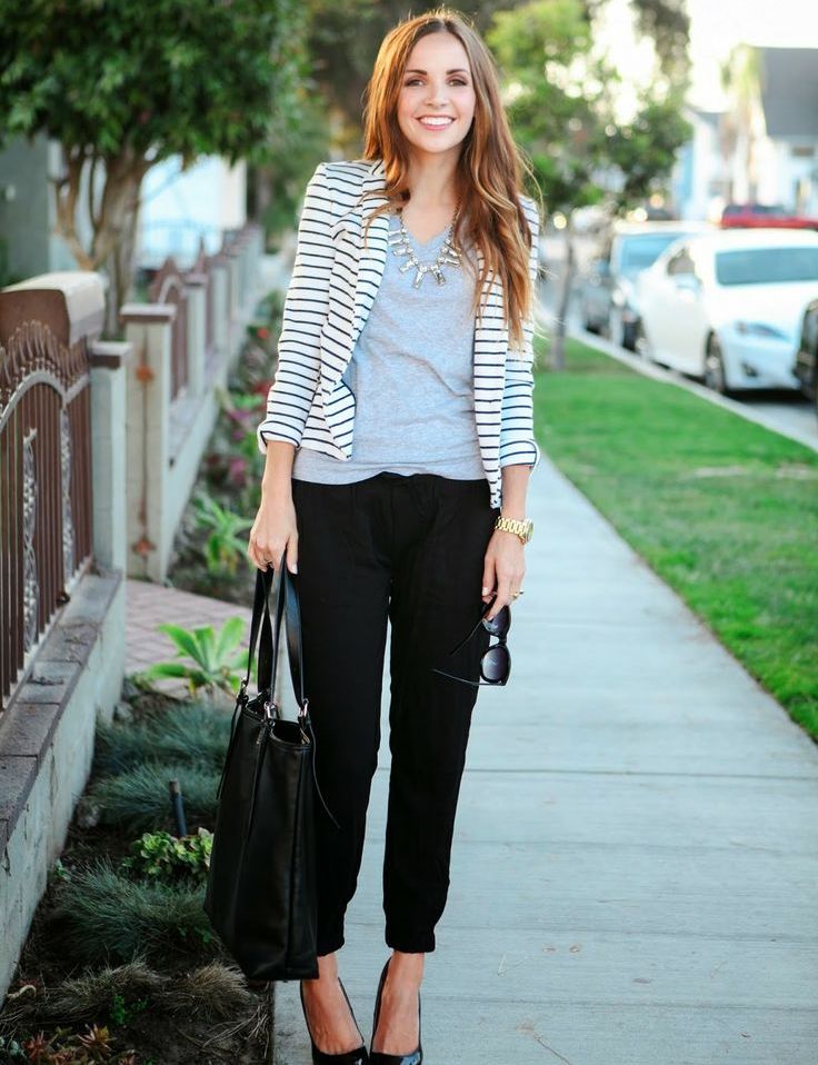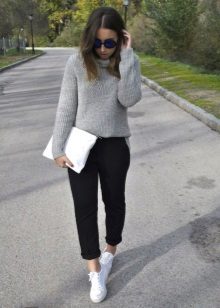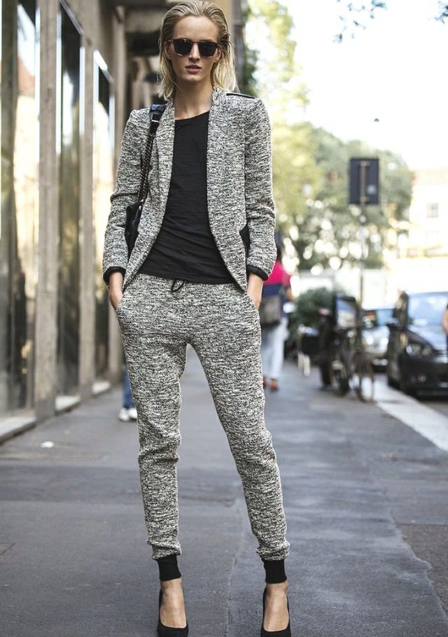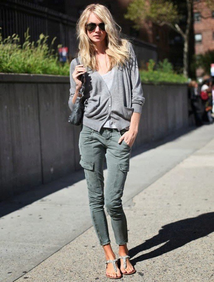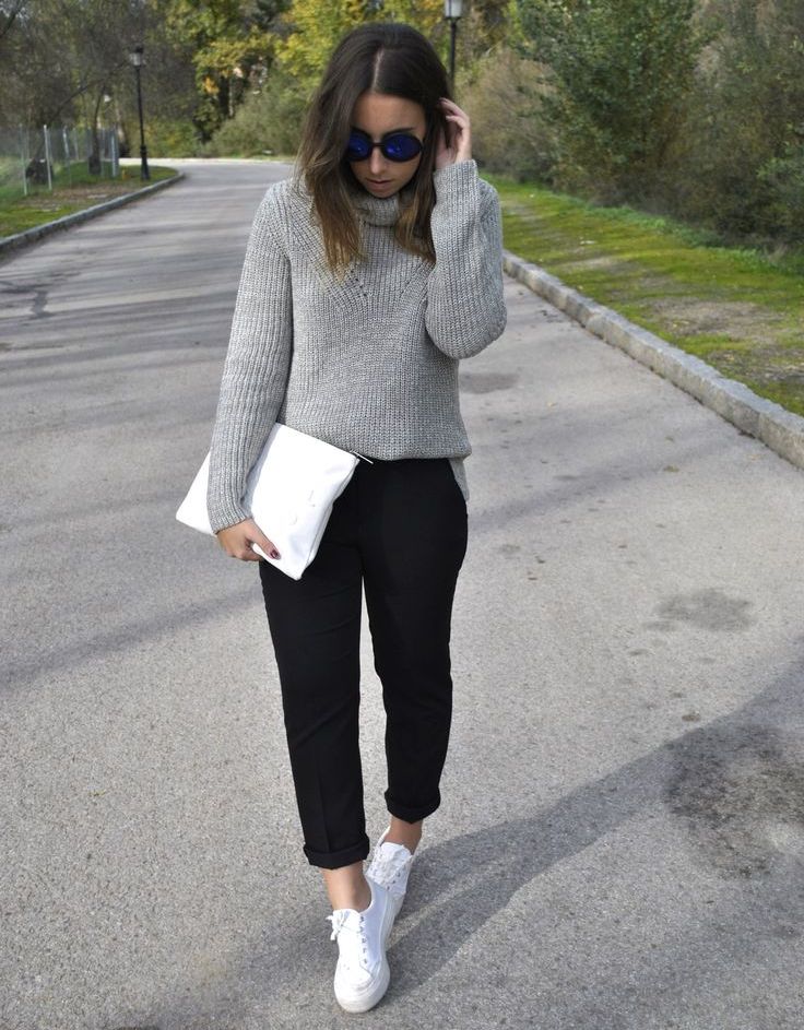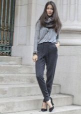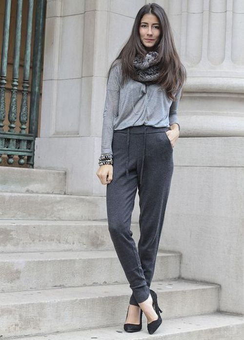 Gray slim pants you probably want to wear to the office too. They do not look as formal as black, but even the most strict dress code allows for a similar color.