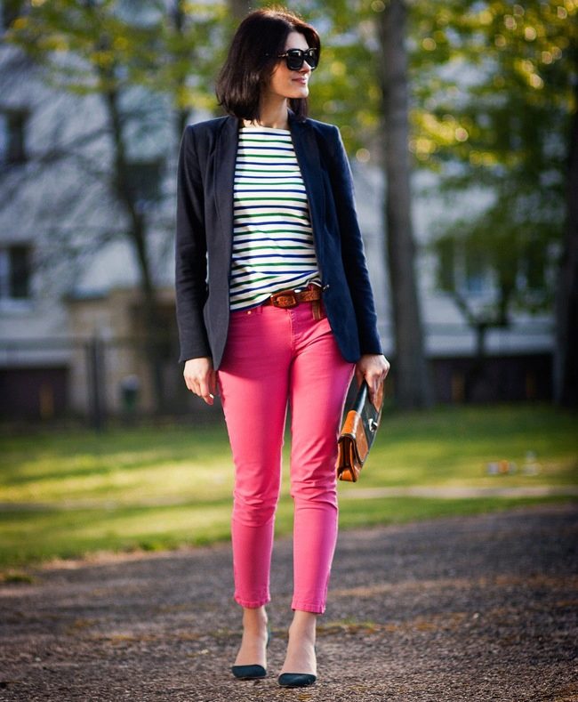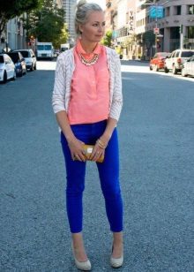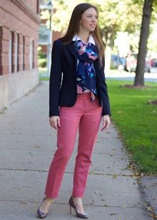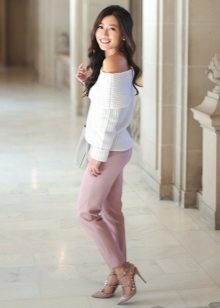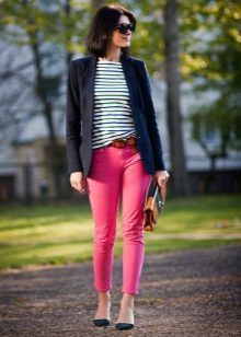 Pink skinny trousers will appeal not only to young, romantic natures, but also to adult girls who want to create a gentle and fresh look.
