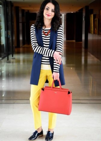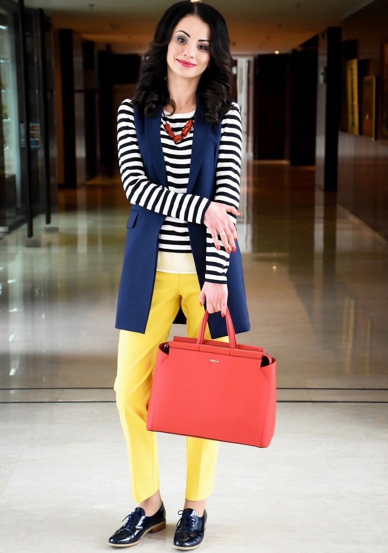 - Rich shades: lemon trousers, coral bag, elongated blue vest, black and white striped sweatshirt and dark blue lacquered oxfords.