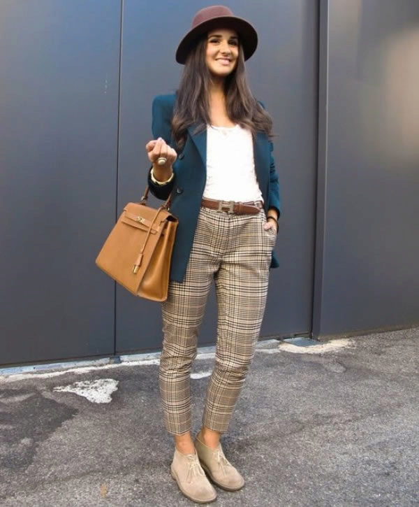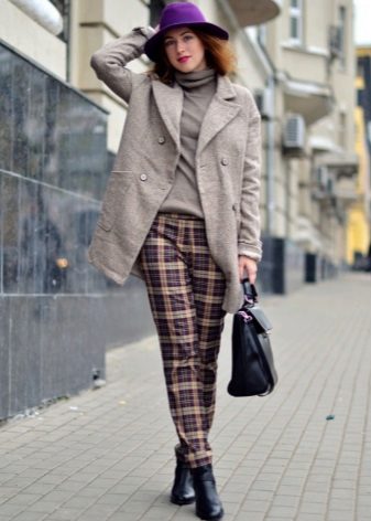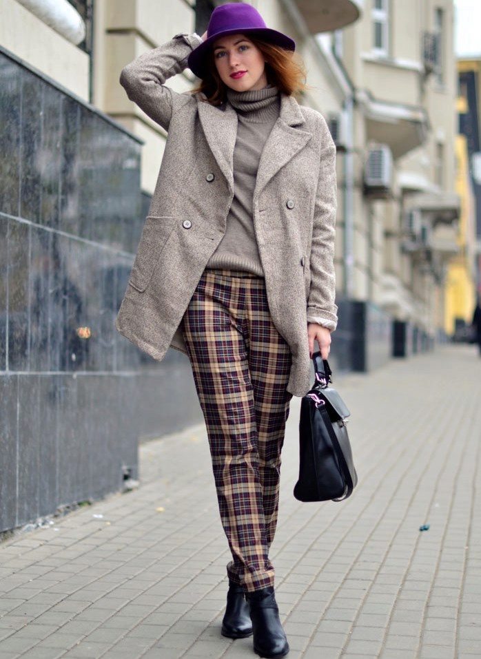 - For a cool autumn: colorful plaid trousers, a loose sweater, a voluminous wool coat, a purple hat, boots and a bag that match the tone.