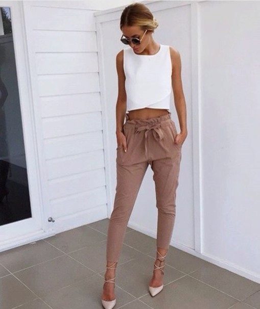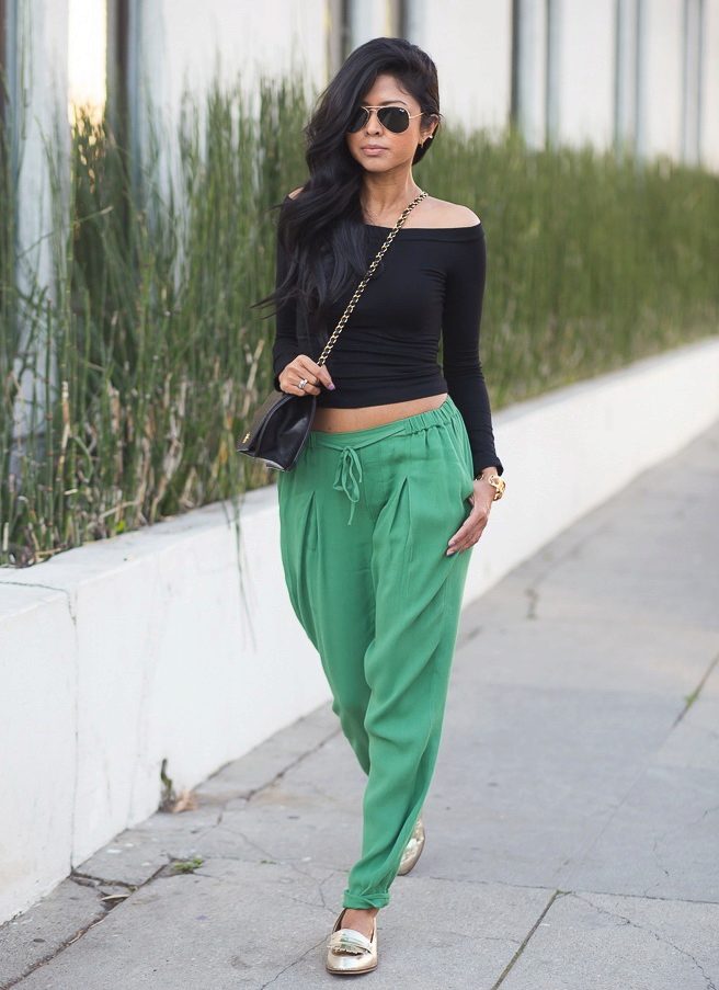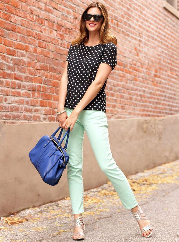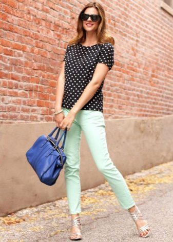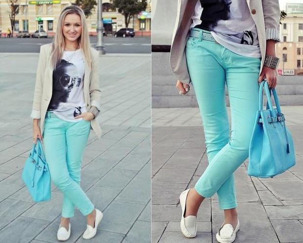 Mint pants have been very popular for the last few fashionable seasons. This bright summer color looks very beautiful and unusual, especially if you choose a top contrasting in color to it.