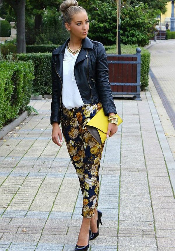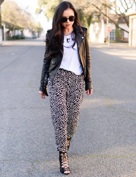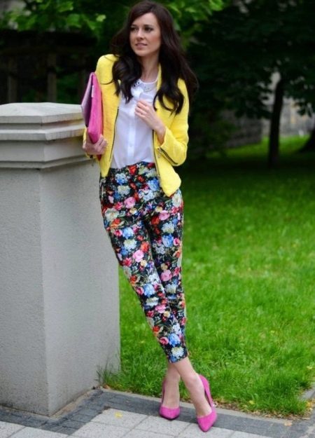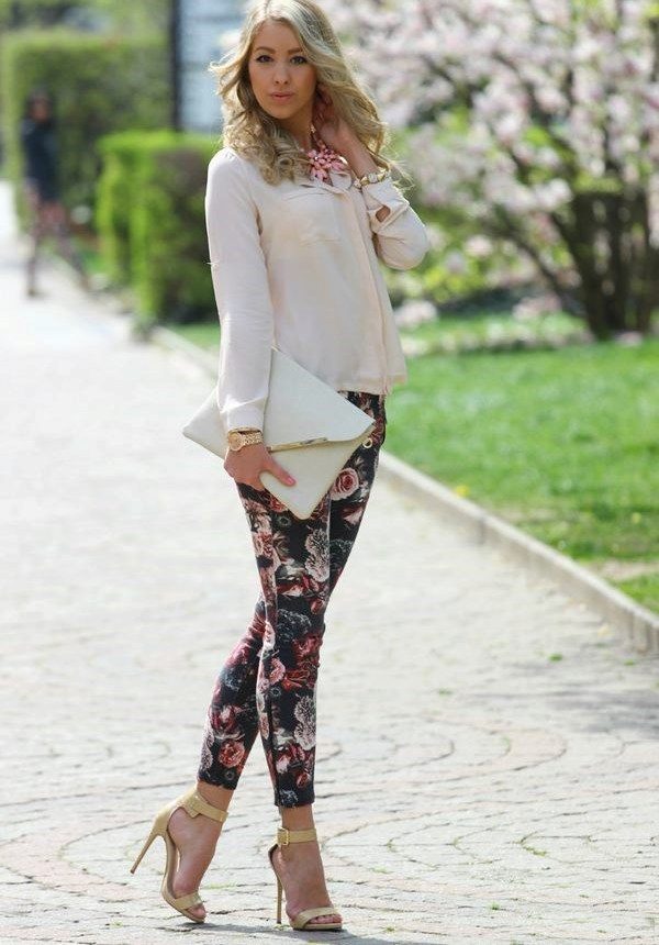 - Spring romance: tight-fitting trousers with a floral print, light shirt, accessories in soft, golden and pastel colors and sandals on a dizzy heel.