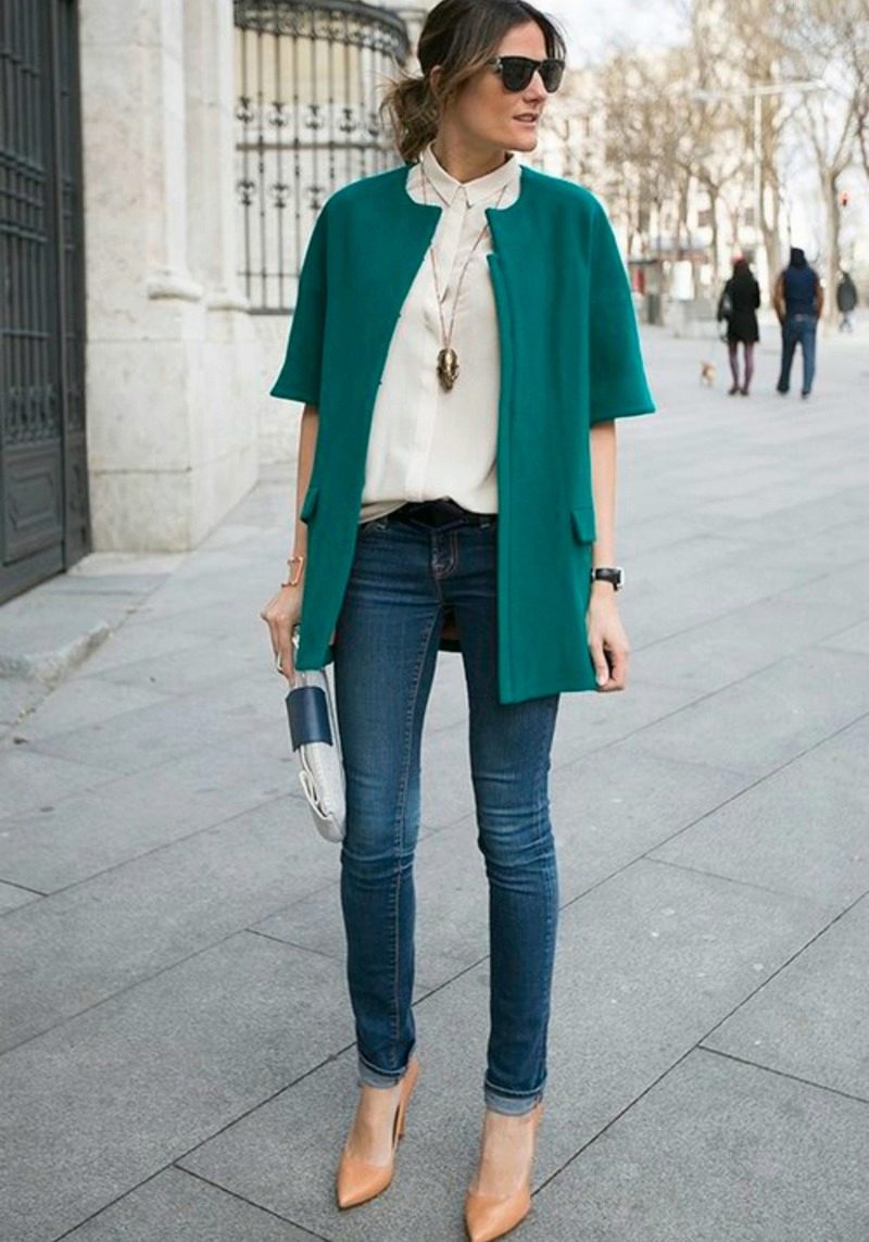 - Casual: classic skinny jeans, white blouse, cardigan with a short sleeve of deep emerald green, flesh-colored boats, vintage pendant and a miniature handbag.