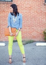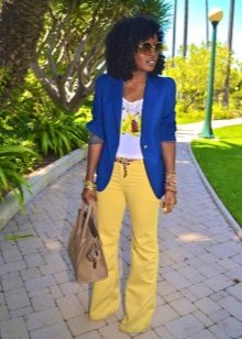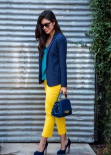 In the summer, with yellow pants will look beautiful shirt without a collar in white in a classic style, and on top of an elegant jacket in turquoise. Under this outfit fit shoes or ankle boots of dark green color.
